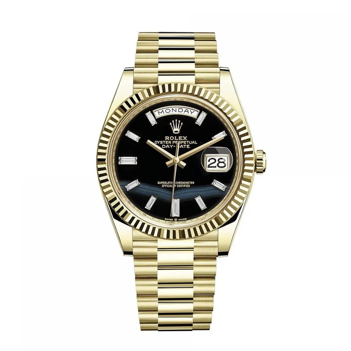 Vỏ Oyster đường kính 40mm của chiếc đồng hồ mà chồng Đoàn Di Băng lựa chọn được đúc từ vàng 18K yellow gold, hợp kim độc quyền của Rolex với độ tinh khiết 99,99% qua quy trình đúc laser 3D tại xưởng riêng. Bezel fluted với họa tiết sóng tích hợp lớp phủ chống trầy xước ceramic, tăng tuổi thọ trong môi trường làm việc. Mặt số onyx đen baguette sử dụng đá onyx mài CNC chính xác 0,01mm, kết hợp 10 mốc giờ kim cương cắt chữ nhật baguette-cut, tạo phản chiếu tự nhiên mà không cần lớp phủ hóa học. Kính sapphire chống tia UV và dây đeo President bằng vàng 18K với mắt xích ba phần bán nguyệt, khóa Crownclasp ẩn sử dụng lò xo micro-điều chỉnh, đảm bảo độ vừa vặn.