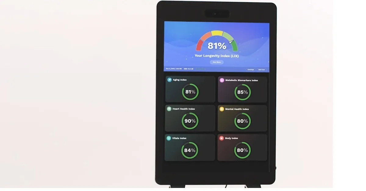 Thiết bị dùng công nghệ TOI để quét lưu lượng máu trên khuôn mặt, từ đó tính toán chỉ số tuổi thọ từ 0 đến 100.