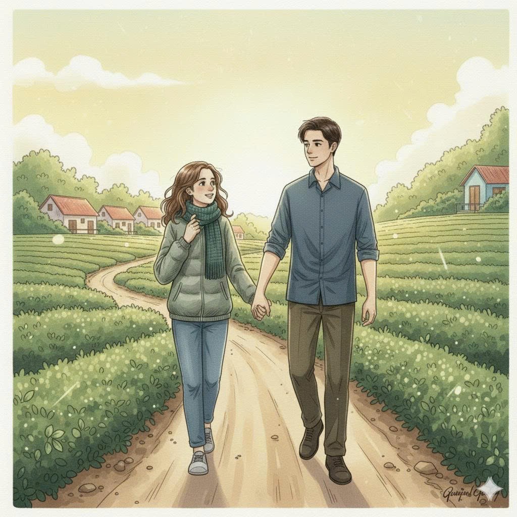 Miên không đáp lại lời Nguyên ngay. Cô chỉ mỉm cười, nhẹ tay siết lấy chiếc khăn màu xanh trên cổ. Lần này không còn là kỷ niệm, mà là một điểm bắt đầu mới. Nguyên cũng không nói thêm gì. Anh chỉ đưa tay ra. Miên nhìn anh một lúc, rồi đặt tay mình vào tay anh. Bàn tay của anh dịu dàng tỏa hơi ấm, xiết nhẹ năm ngón tay của Miên. Hai người bước chậm rãi giữa những luống chè xanh mướt, con đường đất ngoằn ngoèo nhưng không còn đơn độc. Ánh nắng chiếu lên vai họ, rải thứ ánh sáng mềm như nhung của một buổi chiều không còn lạnh giá.