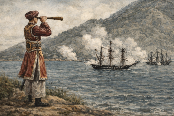 Binh lính triều Nguyễn dùng kính thiên lý quan sát tàu ngoài biển. Tranh tạo bởi Chat GPT