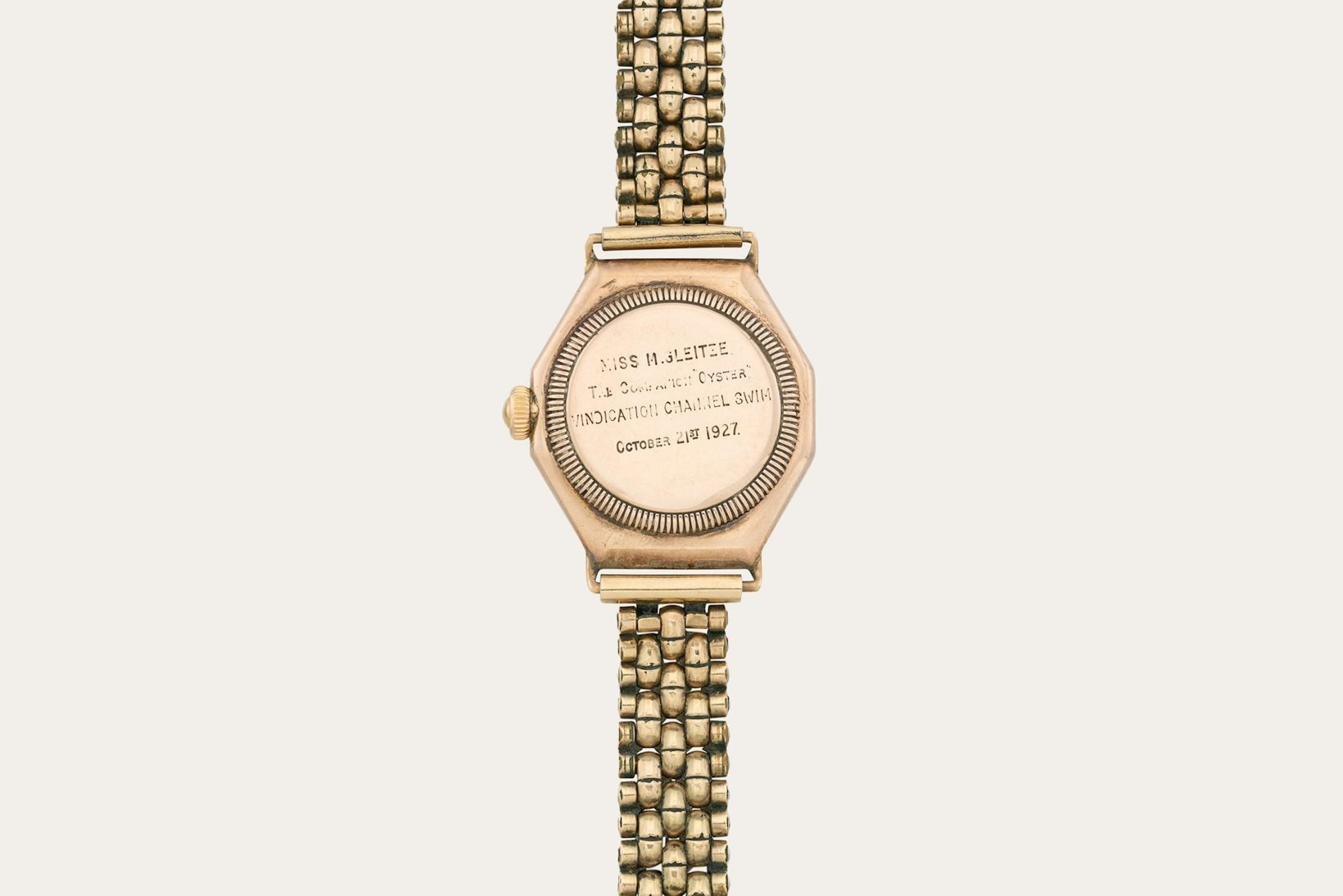 Chiếc Oyster của Mercedes Gleitze không phải mẫu đồng hồ đắt giá hay lộng lẫy. Cỗ máy có đường kính 27 mm, làm từ vàng 9 carat, vỏ bát giác với càng dây mảnh và viền khía, mặt số hồng ánh kim khắc số Ả Rập đen cùng kim lá đen.