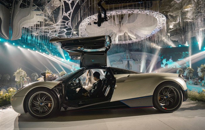 Chiếc siêu xe Pagani Huayra của doanh nhân Minh Nhựa được thay áo khi đám cưới Joyce Phạm được diễn ra.