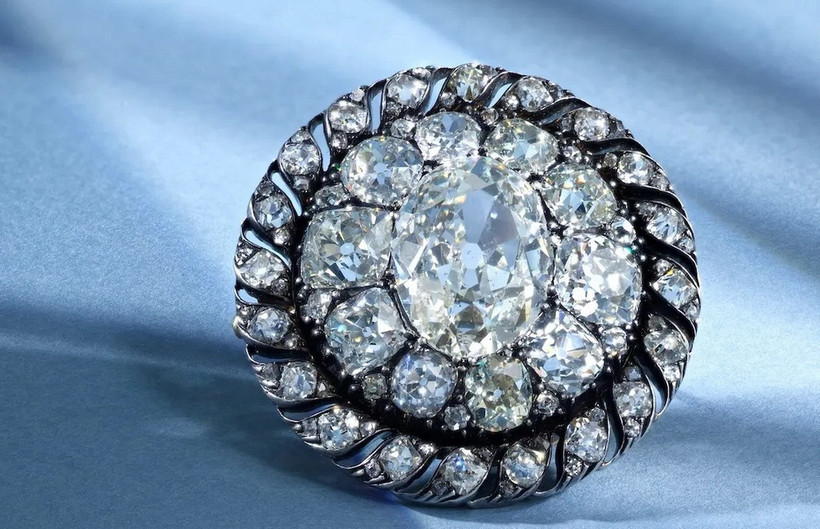 Trong số đó có một chiếc trâm tròn đường kính khoảng 45mm, ở giữa gắn viên kim cương hình bầu dục 13,04 carat, xung quanh là gần 100 viên kim cương cổ xếp thành hai vòng đồng tâm.