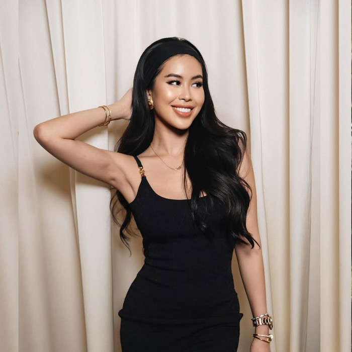 Ái nữ nhà Johnathan Hạnh Nguyễn kết hợp chiếc túi cùng áo blazer đen trắng oversize, layer cùng áo sơ mi lụa trắng và váy ngắn cùng màu áo ngoài, tạo nên tổng thể thanh lịch nhưng không kém phần gợi cảm. Tiên Nguyễn chọn lối trang điểm trong hình ảnh này theo phong cách tự nhiên, với lớp nền mỏng nhẹ, son môi nude và eyeliner mảnh khéo léo nhấn vào đôi mắt, phù hợp với không khí ấm cúng của bối cảnh nội thất gỗ óc chó.