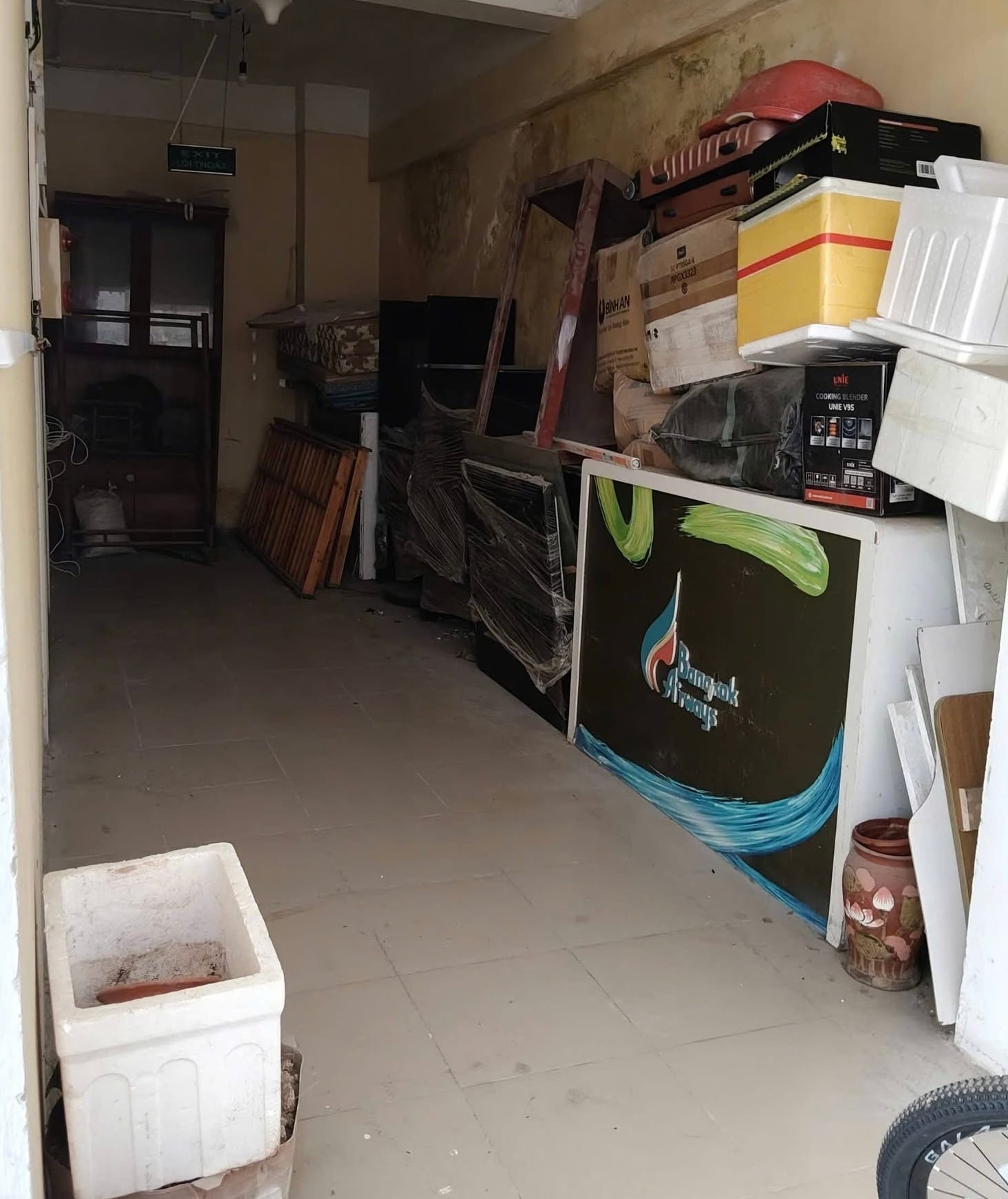 Hành lang chung của chung cư A2 vẫn trở thành nơi chứa đồ dù Ban Đại diện đã thuê người dọn dẹp. ảnh: DN