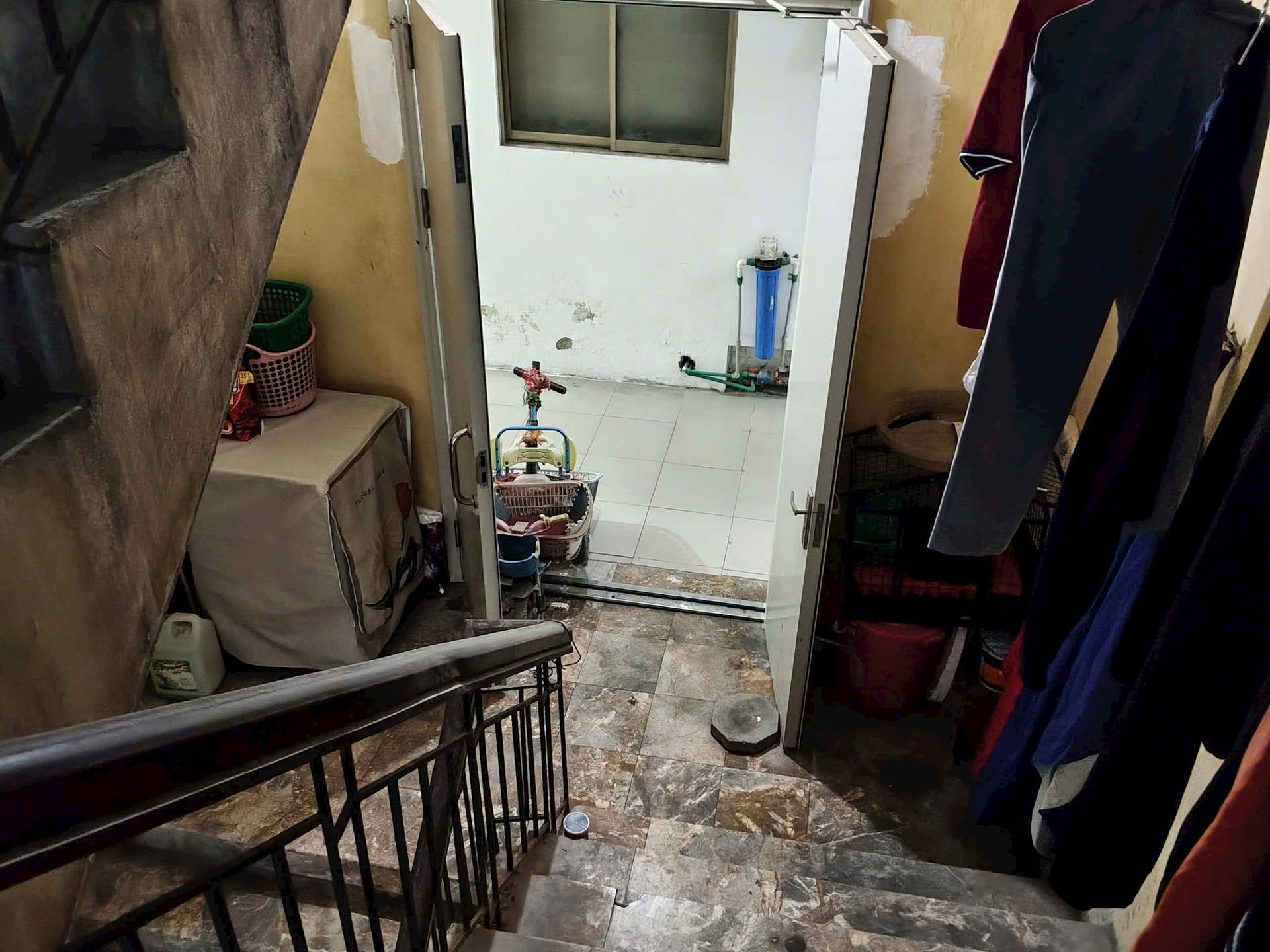 Cầu thang chung biến thành nơi chứa đồ cá nhân. ảnh: DN