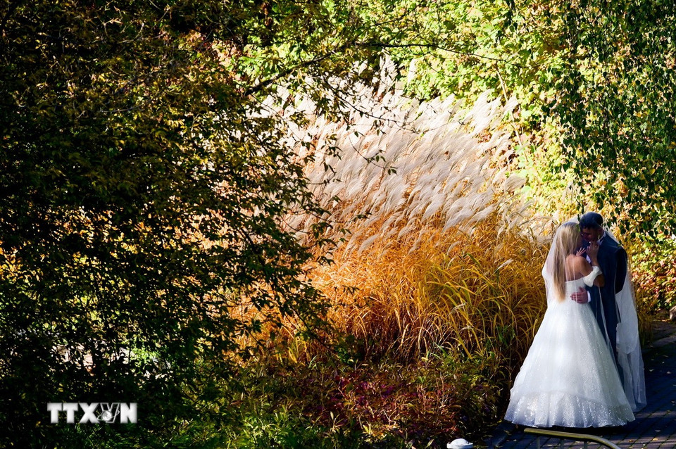 Cặp đôi chụp ảnh cưới trong khu vườn mùa thu tại Vacsava, Ba Lan. (Ảnh: THX/TTXVN)