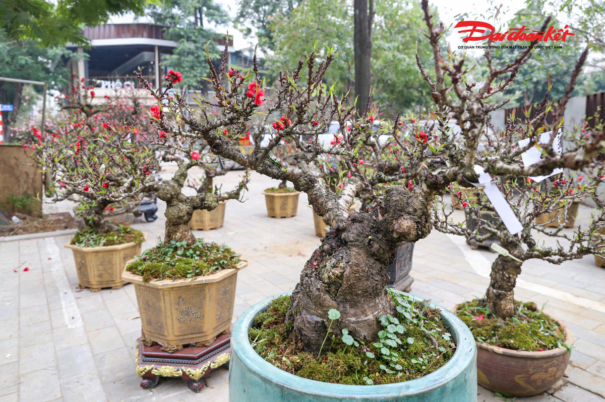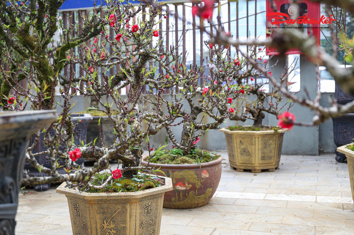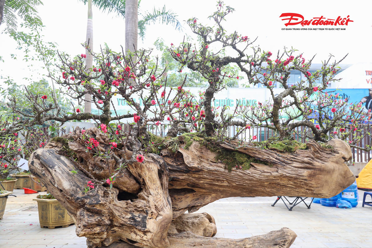 Trên mỗi thân gỗ hoàng đàn, chủ nhân khéo léo ghép từ 3–4 gốc đào Thất Thốn với nhiều dáng thế khác nhau, đan xen hài hòa, tạo nên một tổng thể vừa độc đáo, lạ mắt, vừa mang giá trị thẩm mỹ cao, khiến người xem khó rời mắt.