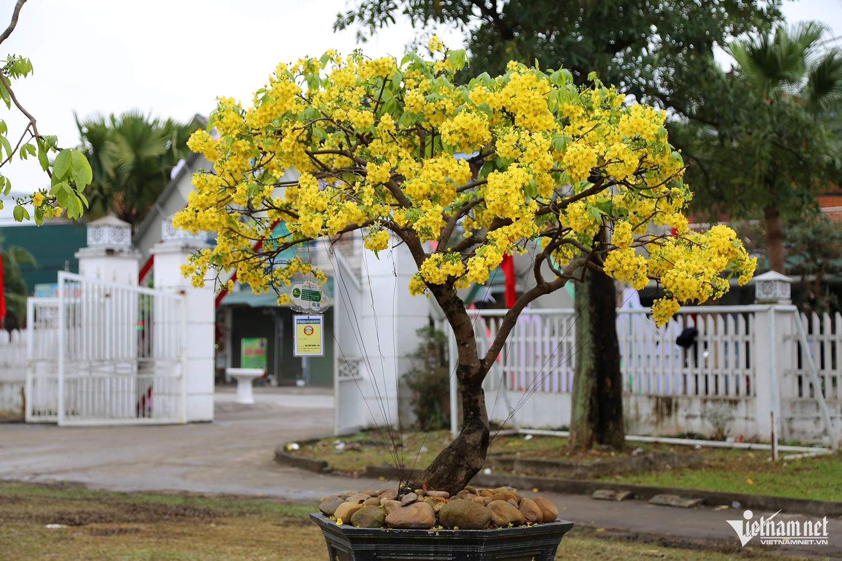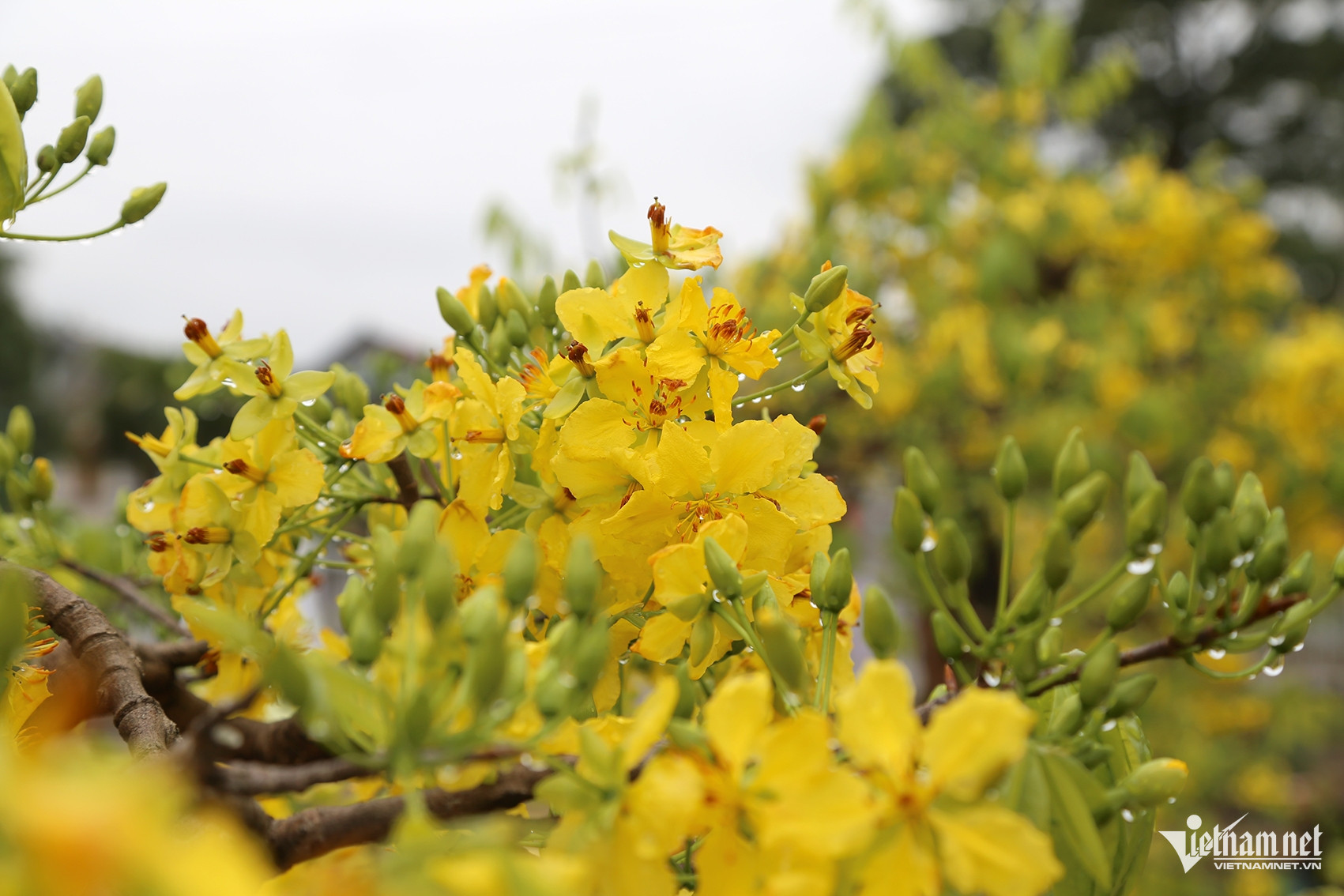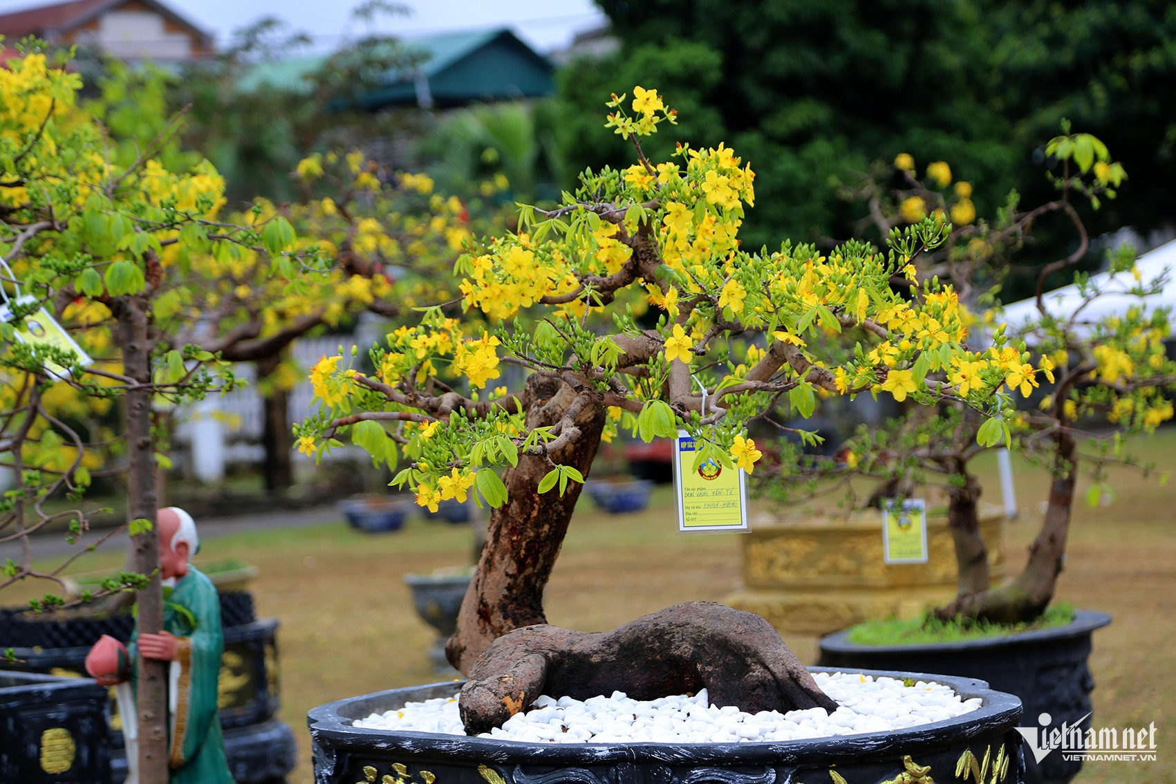 Mai vàng Yên Tử nở bung khoe sắc với chùm lớn và nụ dày đặc trên những cây tại hội chợ. Ảnh: Phạm Công