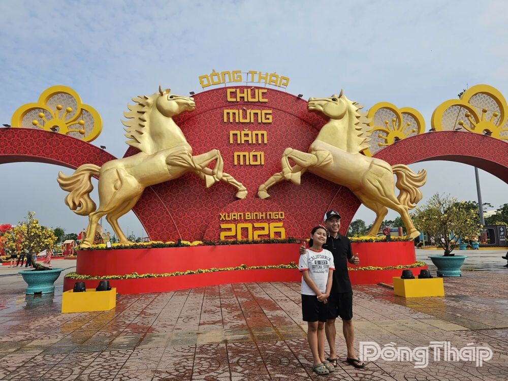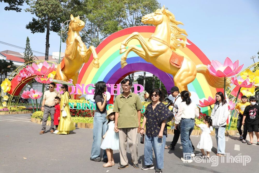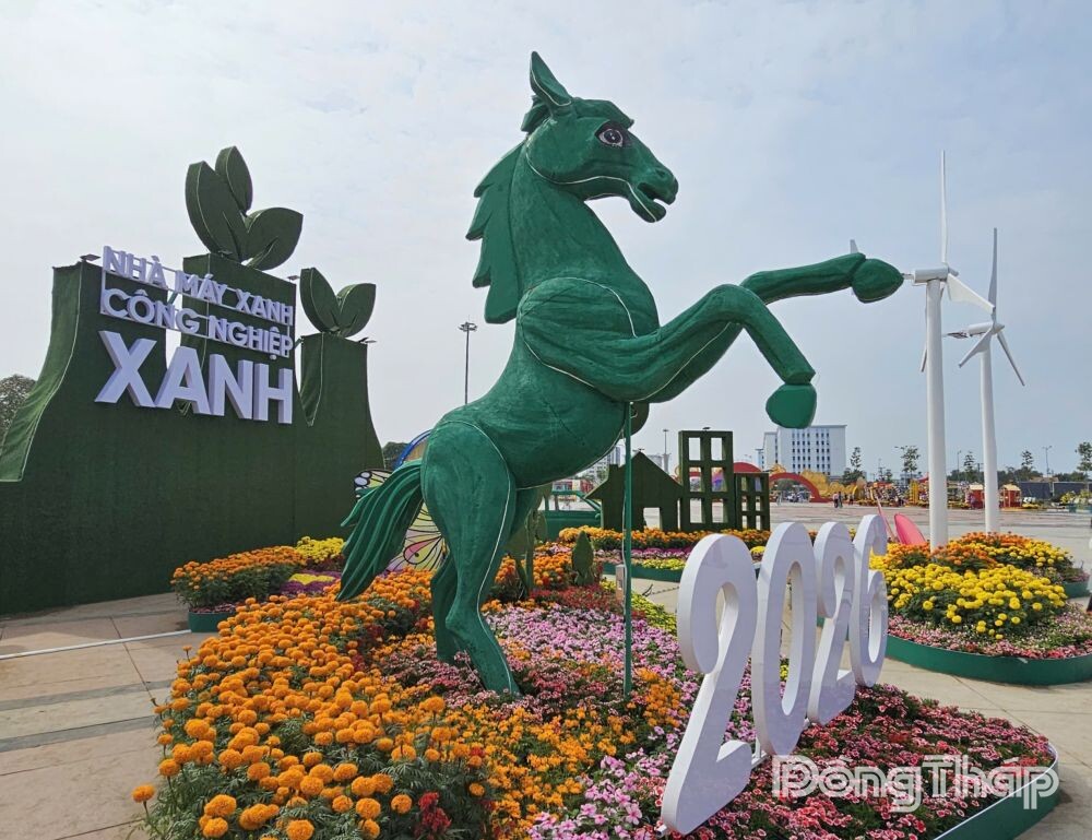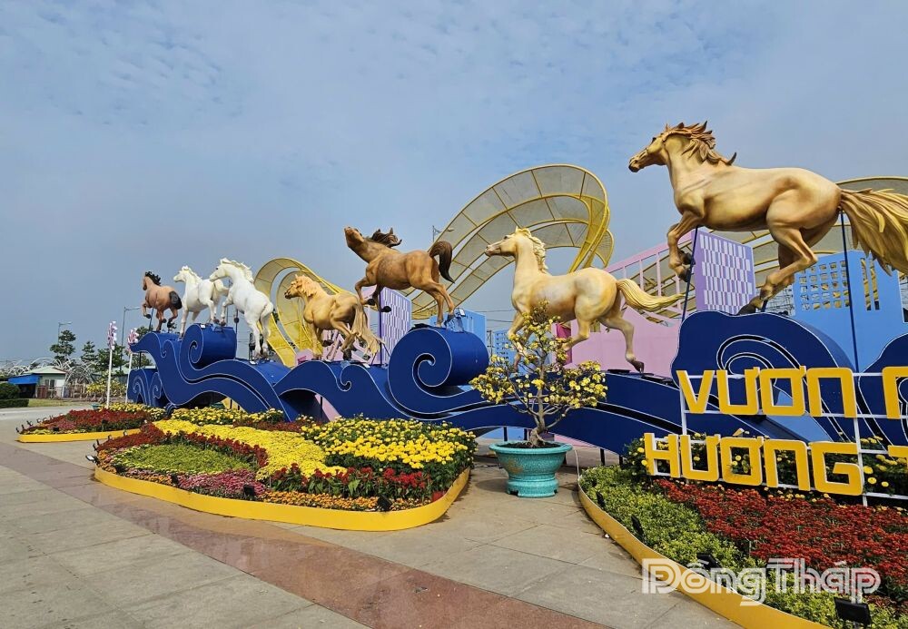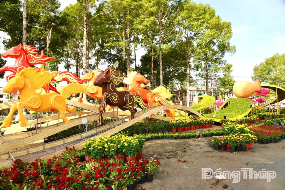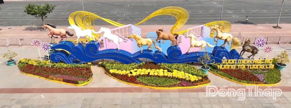 Đường hoa xuân Đồng Tháp Bính Ngọ 2026 với nhiều đại cảnh, tiểu cảnh được lấy cảm hứng từ vẻ đẹp tự nhiên và những giá trị văn hóa đặc trưng của tỉnh, với linh vật “Song mã khai xuân” tại 2 đường hoa.