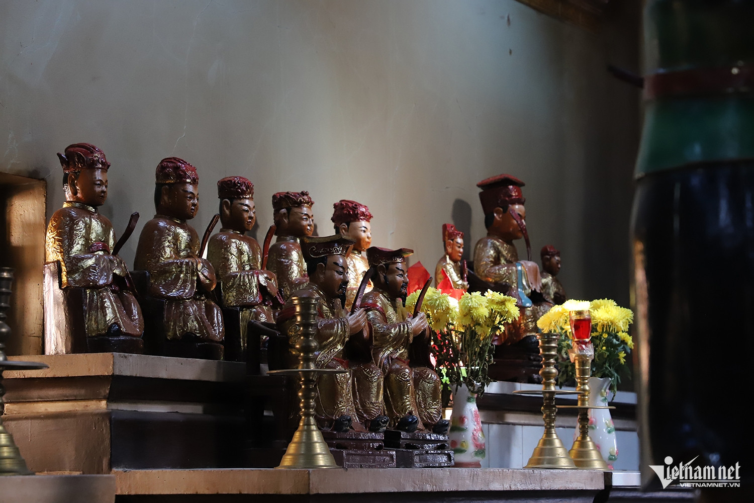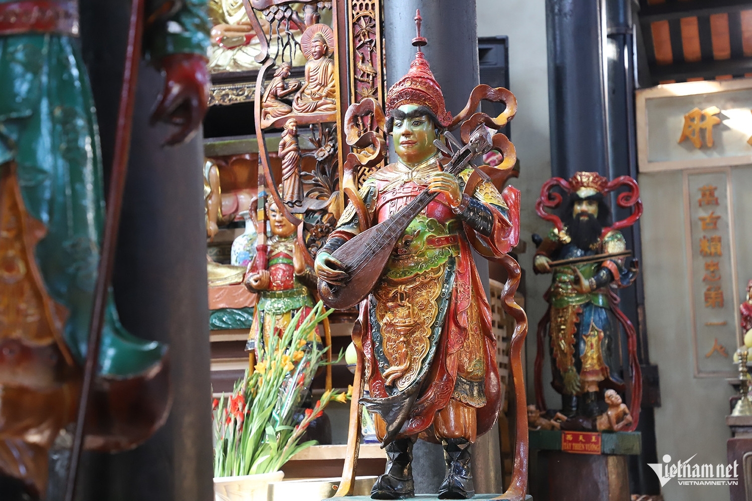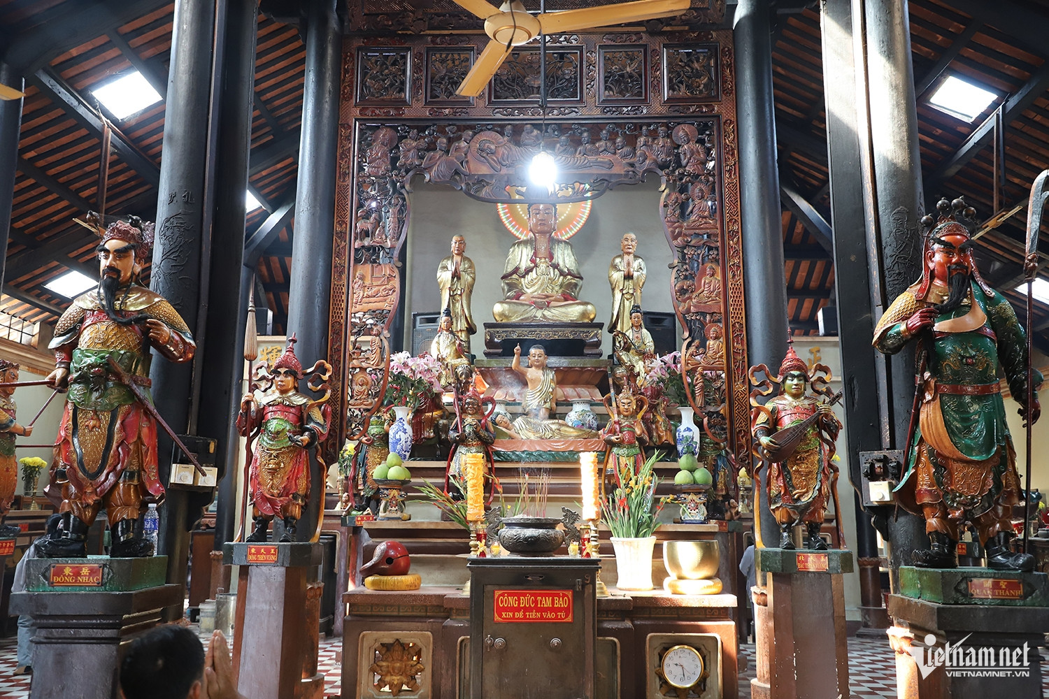 Bên trong chánh điện hiện lưu giữ khoảng 150 pho tượng lớn nhỏ. Các tượng Phật, Bồ Tát, La Hán, Bát bộ Kim Cang, Ngọc Hoàng, Huỳnh Đế, Thần Nông… chủ yếu được tạc từ gỗ cổ thụ, chạm trổ công phu.