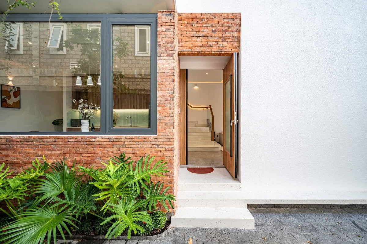 Đáp ứng mong muốn giữ gìn các nét truyền thống của Việt Nam xưa, kiến trúc sư áp dụng giải pháp ốp gạch đỏ giả cổ ở phần kiến trúc bên ngoài. Ảnh: Lilo Studio