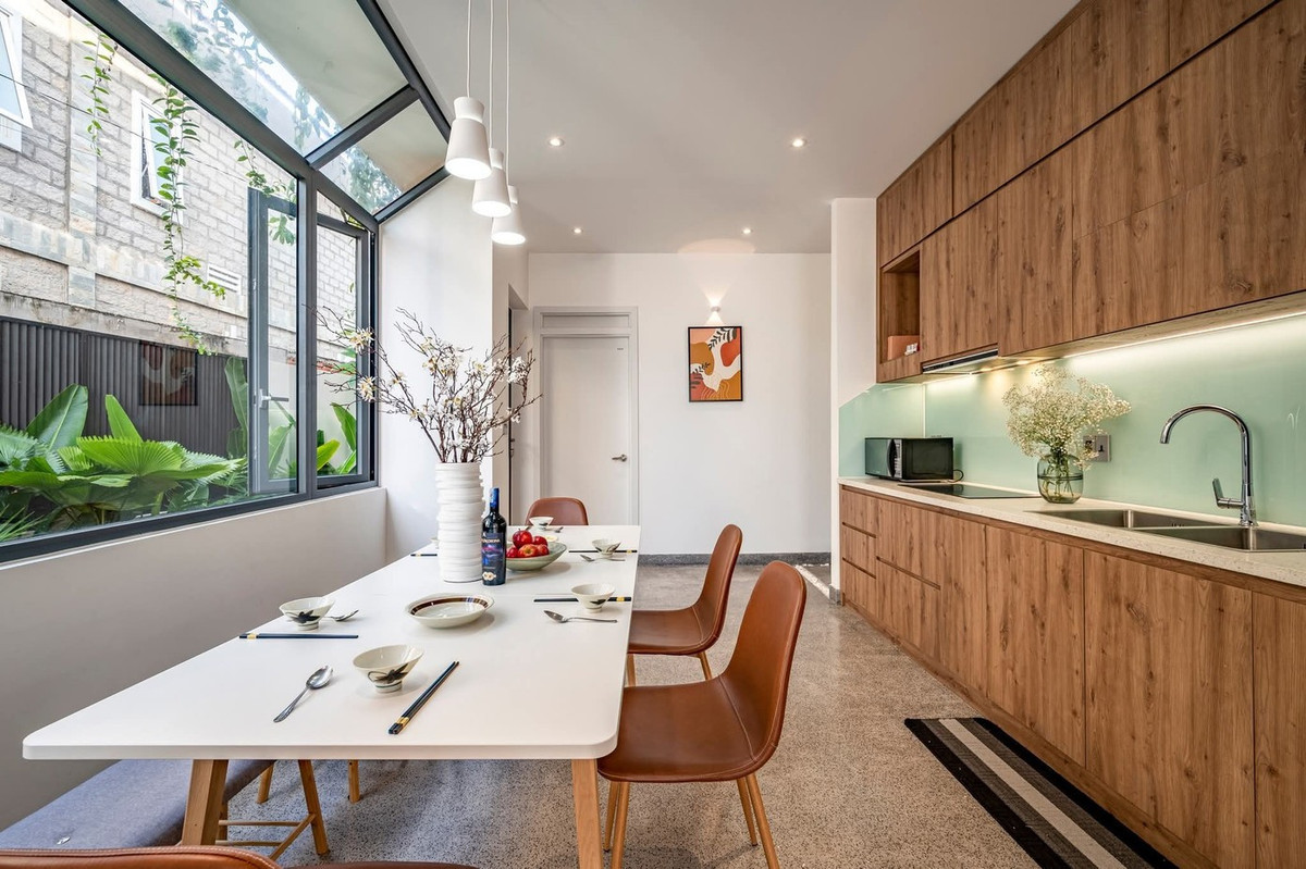 Bếp và bàn ăn bố trí cạnh cửa sổ lớn lấy ánh sáng. Ảnh: Lilo Studio