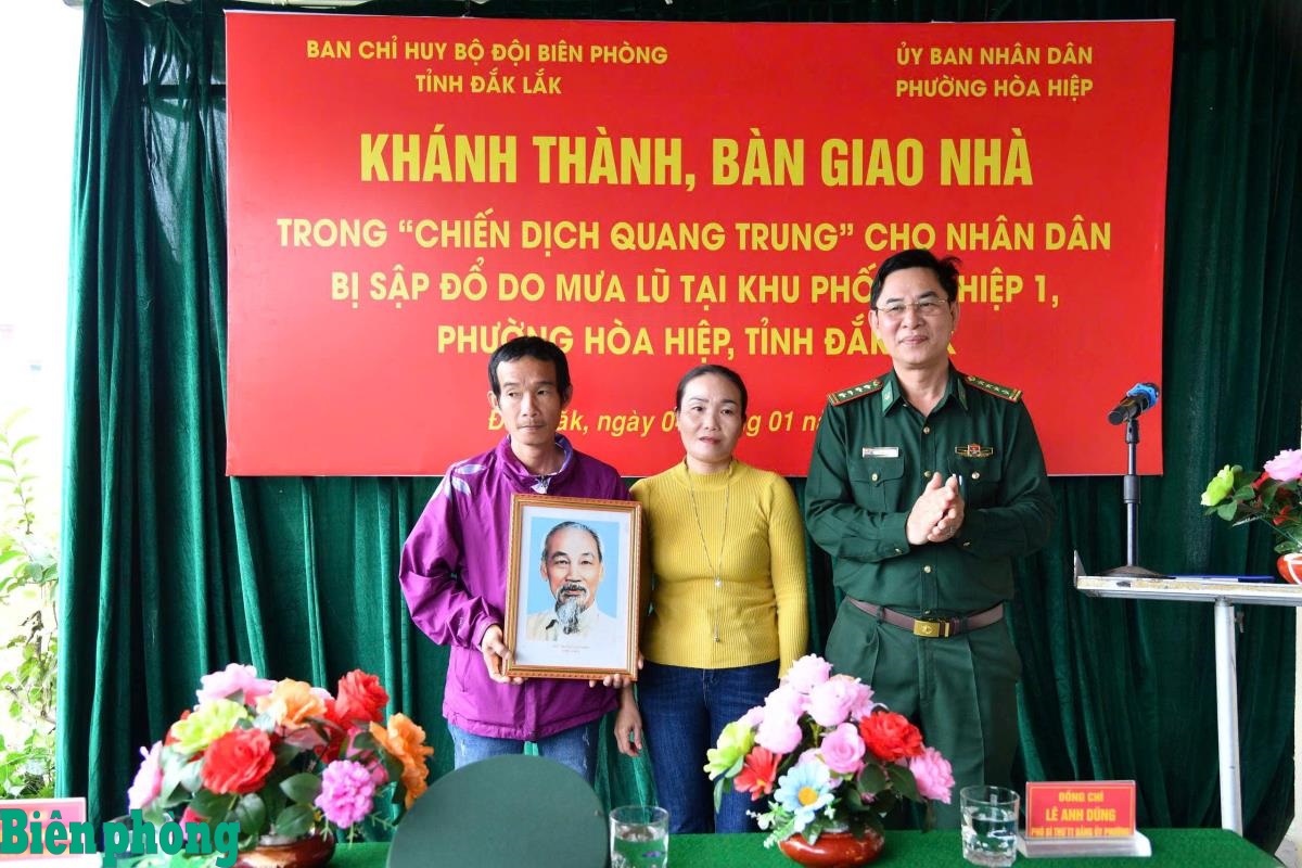 Đại tá Nguyễn Văn Lĩnh, Chỉ huy trưởng Bộ đội Biên phòng tỉnh Đắk Lắk bàn giao nhà và tặng ảnh Bác Hồ cho gia đình ông Trần Thế Lâm, ở phường Hòa Hiệp, tỉnh Đắk Lắk. Ảnh: Ngọc Lân