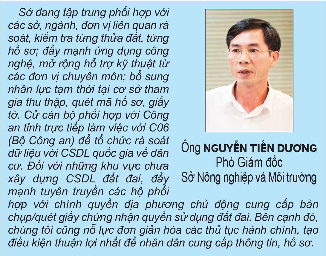 Tỉnh ta đã thành lập ban chỉ đạo và tổ công tác cấp tỉnh, cấp xã; các sở, ngành, địa phương chủ động bố trí nguồn lực con người, hạ tầng kỹ thuật, phần mềm, kinh phí tổ chức thực hiện đảm bảo rõ người, rõ việc, rõ thời gian, rõ kết quả. Qua rà soát, toàn tỉnh có 358.149 thửa đất đủ thông tin giấy chứng nhận và chủ sử dụng đất; trong đó, hơn 252.500 thửa đã được xác thực thành công với CSDL quốc gia về dân cư; 50.436 thửa có sai lệch thông tin và trên 55.000 thửa không thể rà soát với CSDL quốc gia về dân cư. Bên cạnh đó, còn hơn 644.800 thửa đất thiếu một trong những trường thông tin về giấy chứng nhận quyền sử dụng đất, chủ sử dụng đất, cần tiếp tục bổ sung, chỉnh lý.
