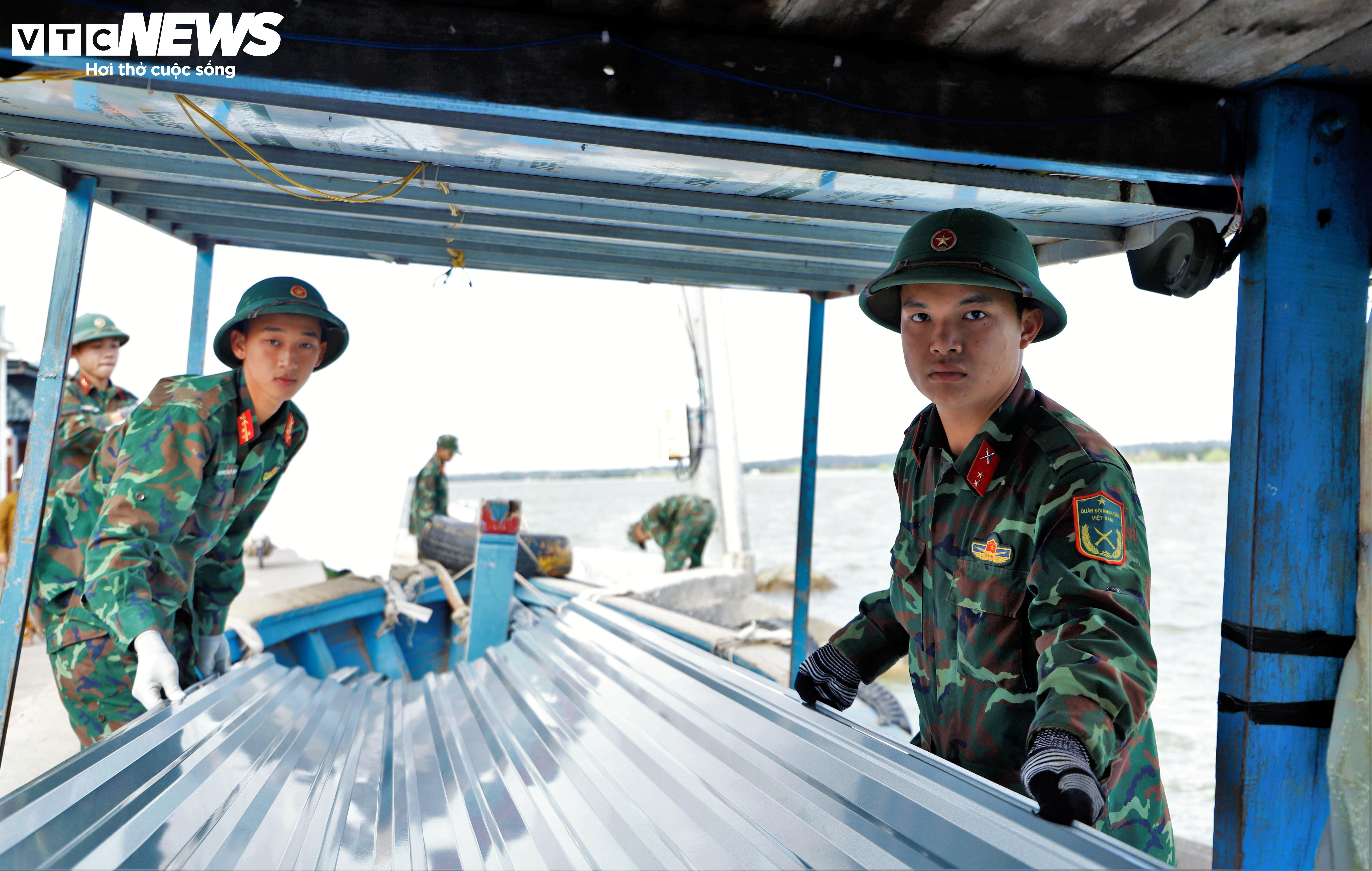 Tại bến đò Phước Sơn (xã Tuy Phước Đông), hàng chục cán bộ, chiến sỹ Tiểu đoàn 7 (Bộ Tham mưu - Quân đoàn 34) ngayf đầu tiên của năm 2026 vẫn miệt mài vác từng tấm tôn, thanh sắt xà gồ bỏ lên thuyền để vận chuyển qua bên Cồn Chim (thôn Vinh Quang) dựng lại nhà cho 8 hộ dân.