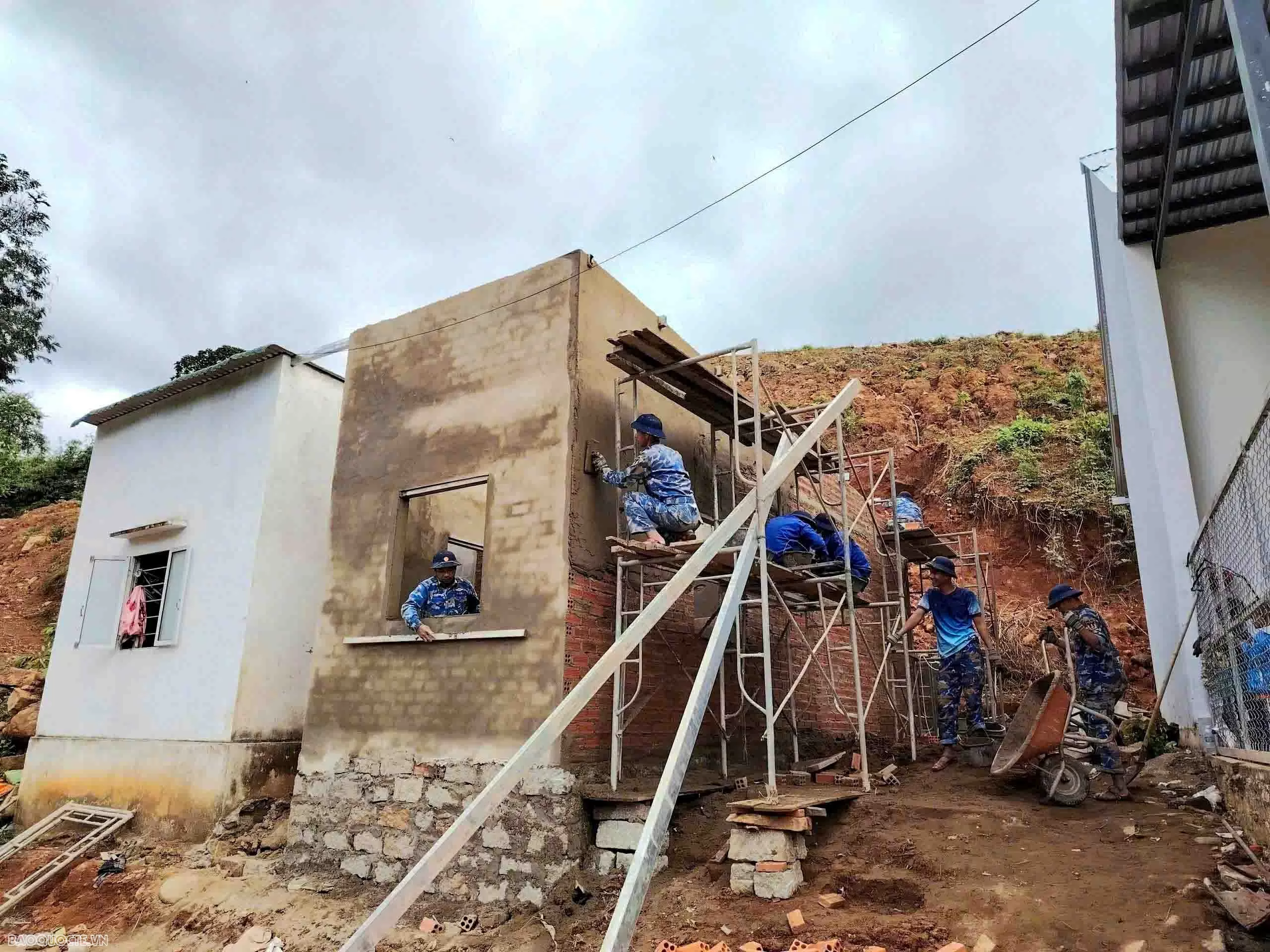 Chiến sĩ Vùng 4 Hải quân xây tường cho hộ dân Nguyễn Thị Tàu, thôn Thạch Tuân 2, xã Hòa Xuân, Đắk Lắk. (Ảnh Vùng 4 Hải quân cung cấp)