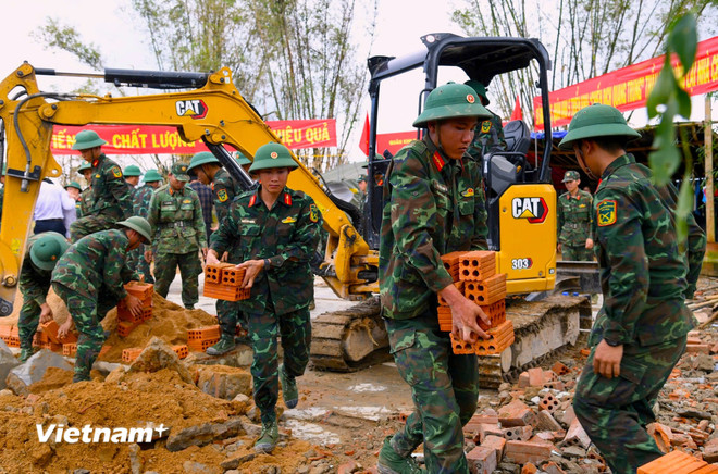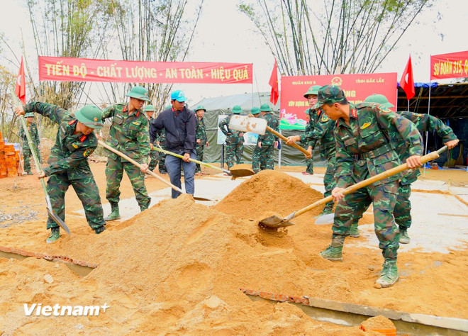 Ngau sau buổi lễ ra quân tại Đắk Lắk, lực lượng vũ trang Quân khu 5 đã bắt tay vào công cuộc tái thiết nhà cho người dân. (Ảnh: PV/Vietnam+)