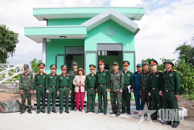 Đoàn công tác và đơn vị thi công cùng hộ dân bên căn nhà mới đã hoàn thành.