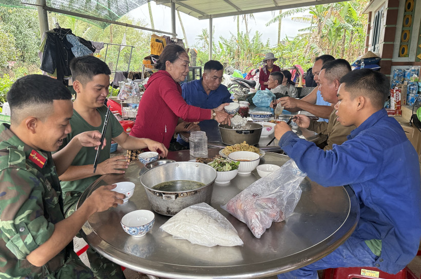 Chiến sỹ Quân khu 5 cùng người dân xã Hòa Thịnh ăn uống, nghỉ ngơi sau một ngày làm việc vất vả. (Ảnh: Tường Quân/TTXVN)
