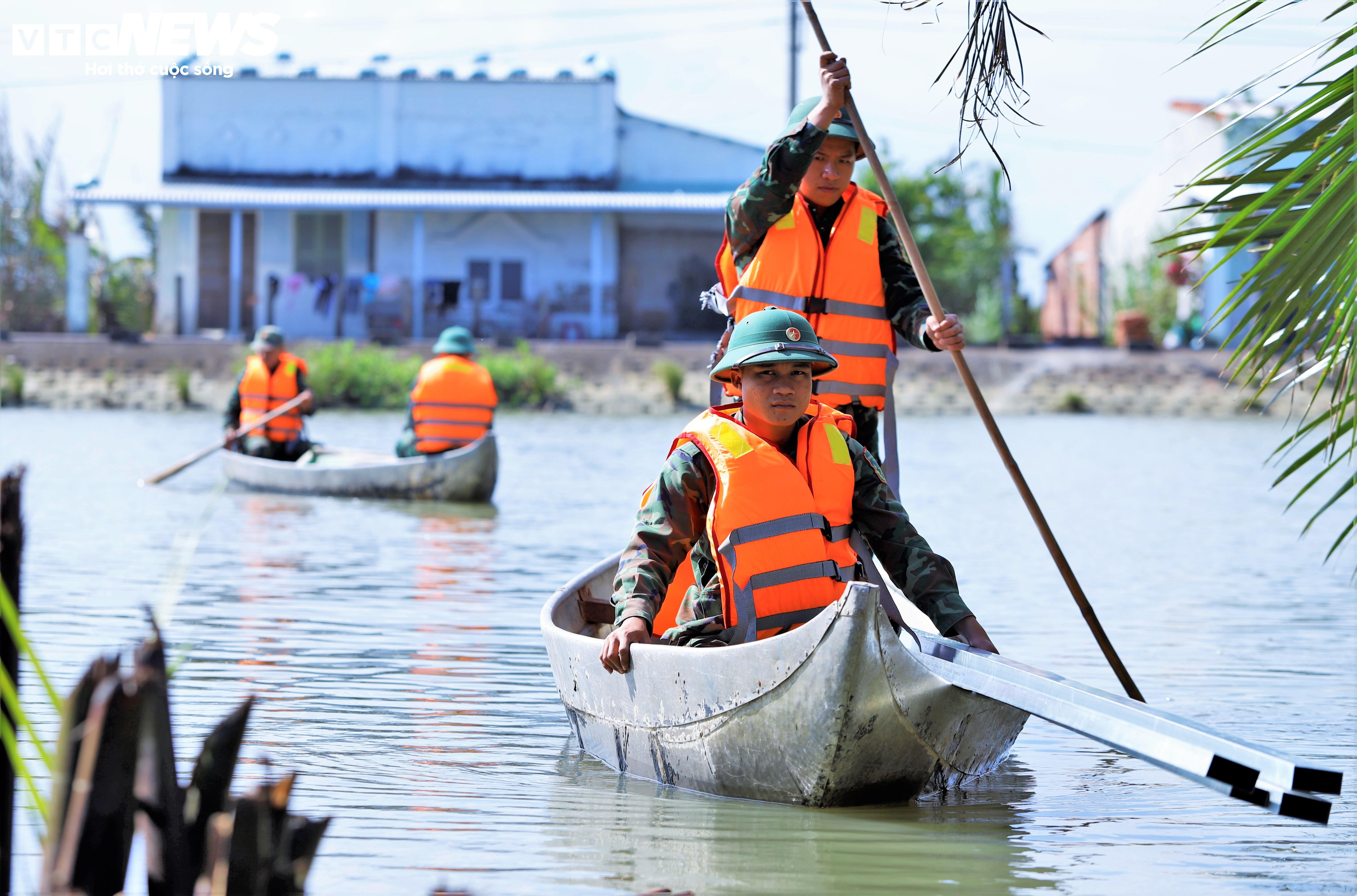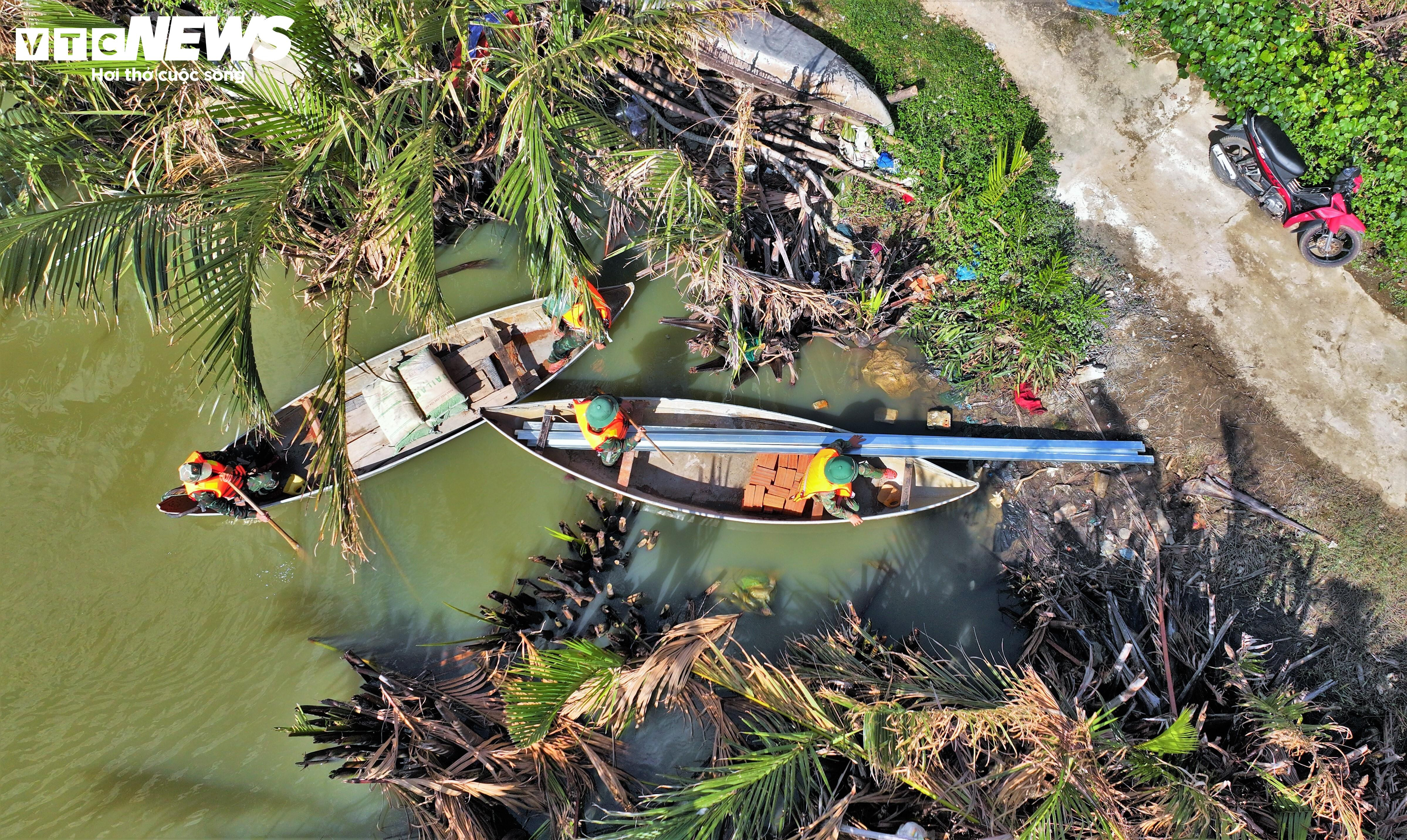 Mỗi ngày các cán bộ, chiến sỹ Trung đoàn 739 vận chuyển hàng trăm chuyến ghe thuyền xi măng, gạch, thép, xà gồ,... xây nhà suốt ngày đêm để người dân có nhà mới trước 15/1/2026.