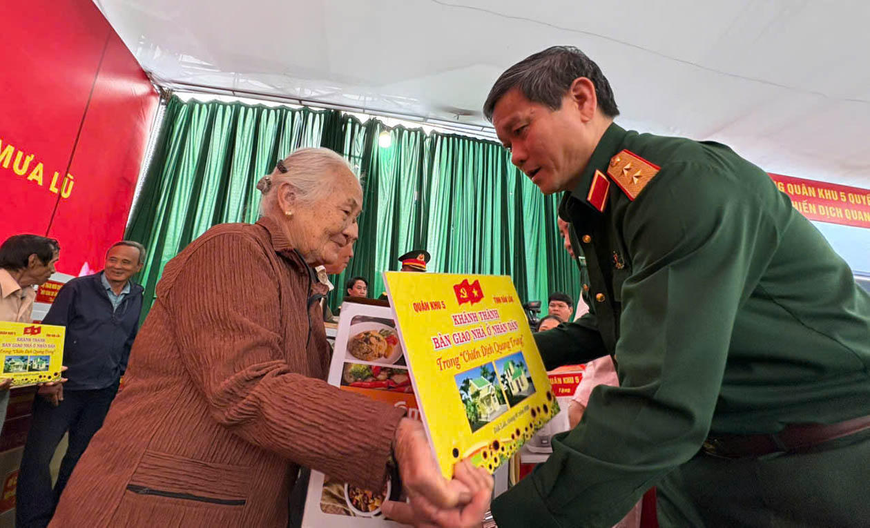 Trung tướng Lê Ngọc Hải - Tư lệnh Quân khu 5 bàn giao nhà cho hộ gia đình ở tỉnh Đắk Lắk. (Ảnh trong bài: Đình Phùng)