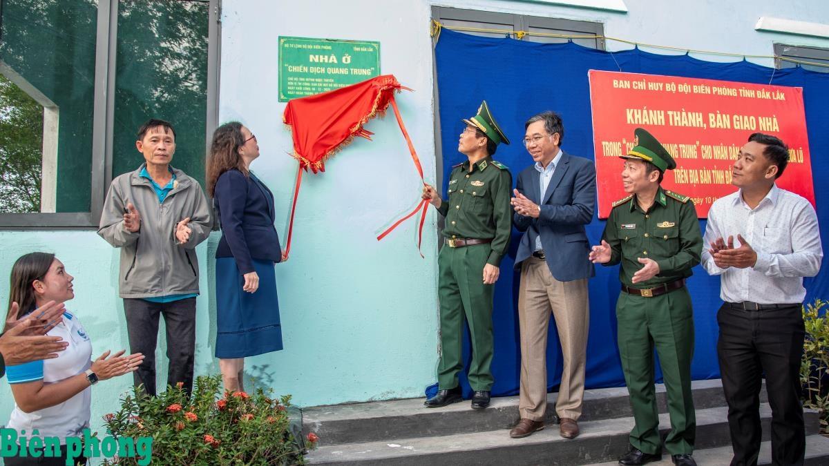 Thiếu tướng Vũ Quốc Ân, Ủy viên Ban Thường vụ Đảng ủy, Phó Chính ủy Bộ đội Biên phòng và đồng chí Phạm Thị Ngọc Tuyết, Phó Chủ tịch Ủy ban Mặt trận Tổ quốc tỉnh Đắk Lắk kéo băng khánh thành nhà. Ảnh: Lê Văn Chương