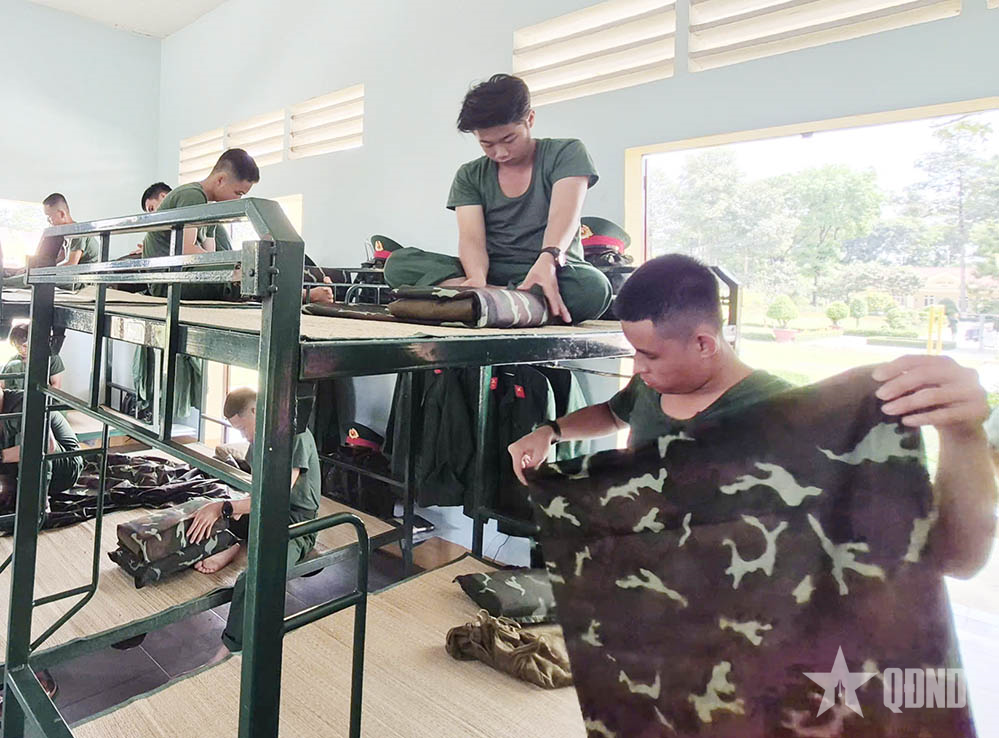 Chiến sĩ mới thực hành gấp xếp nội vụ.