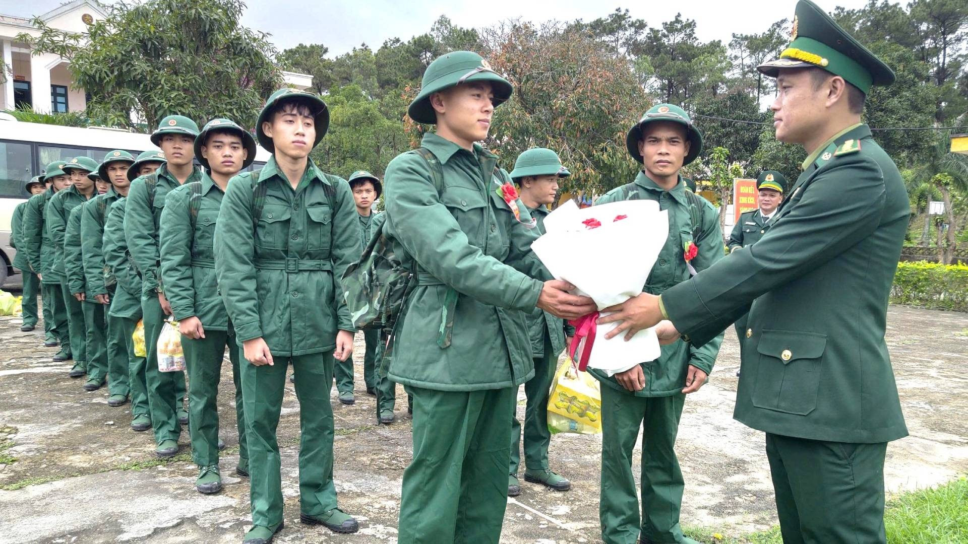 Thủ trưởng Ban Chỉ huy Bộ đội Biên phòng tỉnh Quảng Trị trao đổi, dặn dò các tân binh trước khi về đơn vị mới.
