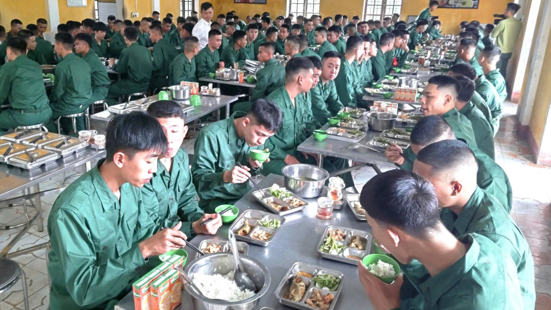 Hơn 200 chiến sĩ mới ăn bữa cơm đầu tiên trong tâm thế người chiến sĩ Bộ đội Biên phòng. Hầu hết các bạn đều ăn hết khẩu phần.