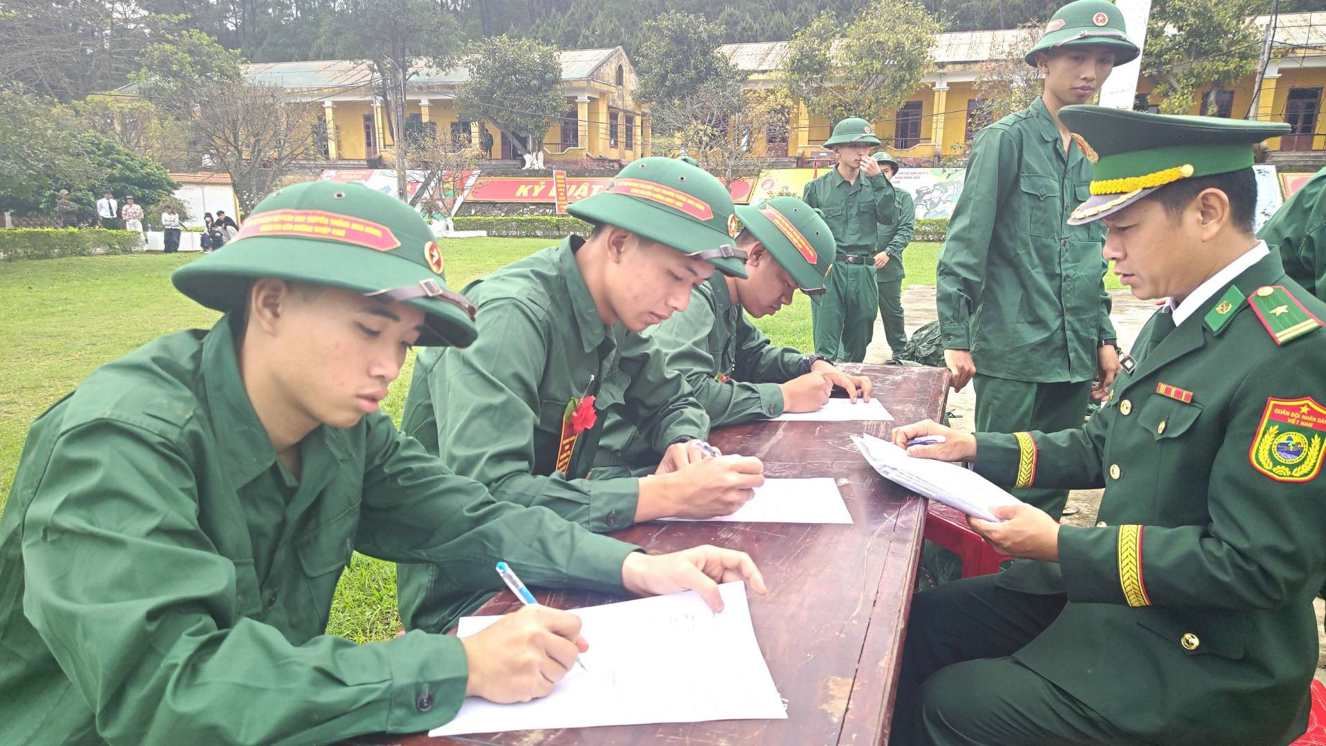 Các chiến sĩ mới được hướng dẫn ghi các ưu điểm, năng khiếu của bản thân trong buổi đầu được tiếp đón ở đơn vị huấn luyện.