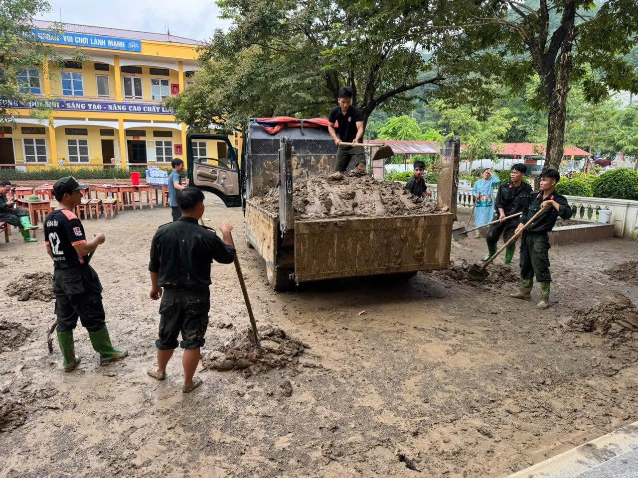 Sáng 5/10, hàng chục chiến sĩ cảnh sát cơ động có mặt tại một trường mầm non ở phường Hà Giang 2, tỉnh Tuyên Quang để hỗ trợ dọn dẹp sau cơn bão số 10 (Bualoi). Sân trường ngổn ngang bùn đất, nhiều vật tư, đồ dùng của nhà trường bị hư hại sau trận lũ lịch sử.