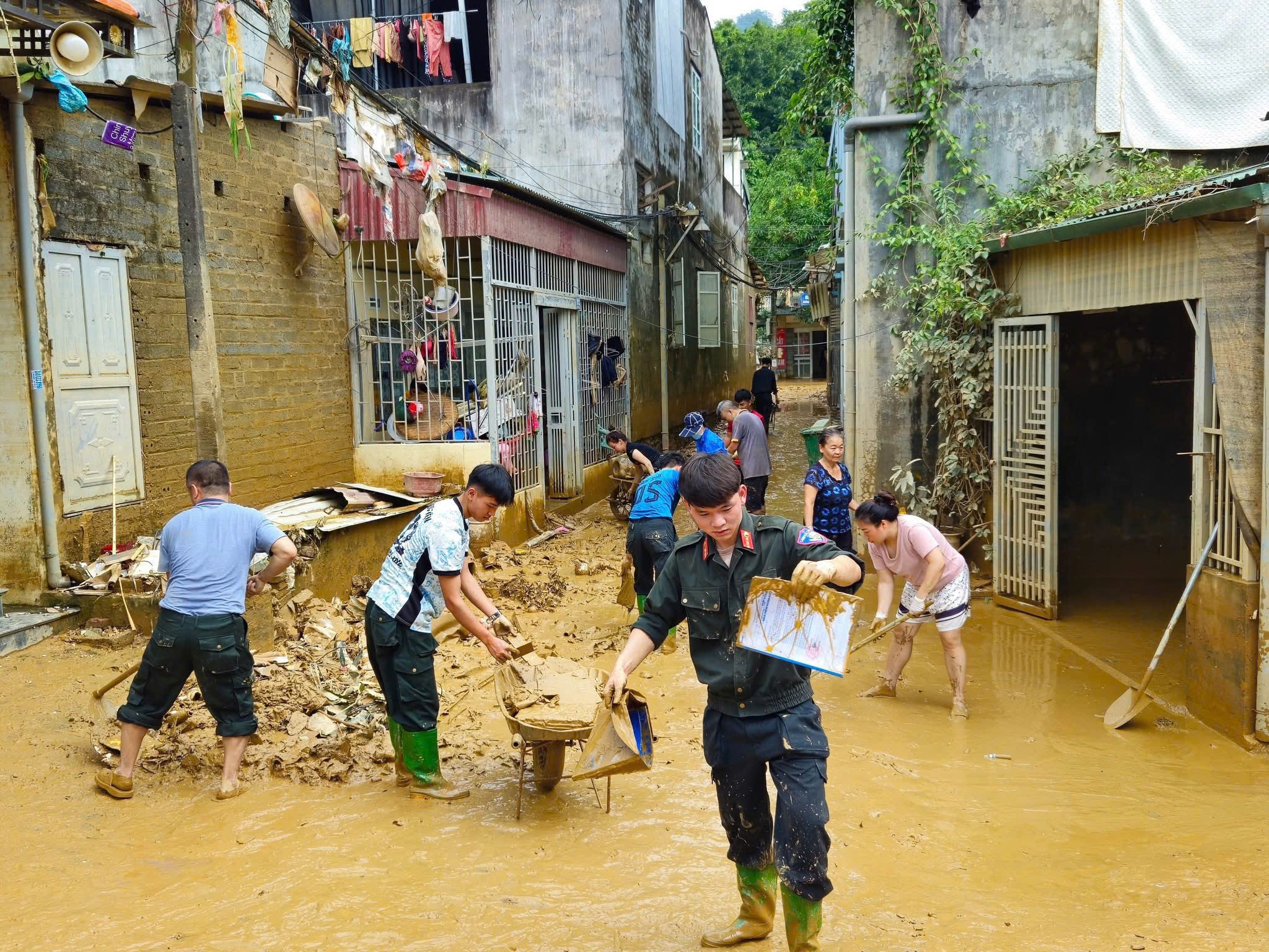 Các chiến sĩ cảnh sát cơ động hỗ trợ người dân Hà Giang dọn dẹp bùn đất sau bão số 10.