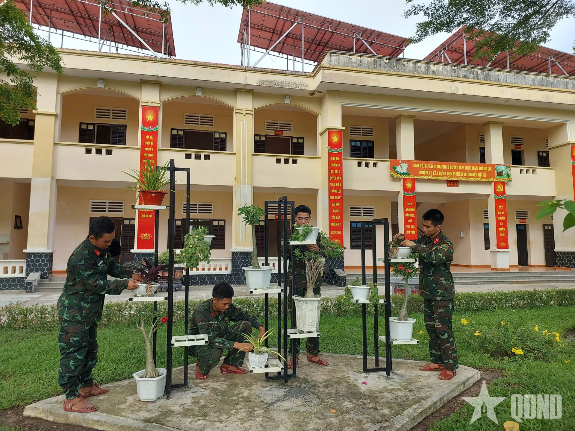 Chiến sĩ Đại đội 2, Tiểu đoàn Thông tin 18 chăm sóc vườn hoa chuẩn bị đón Tết Bính Ngọ 2026.