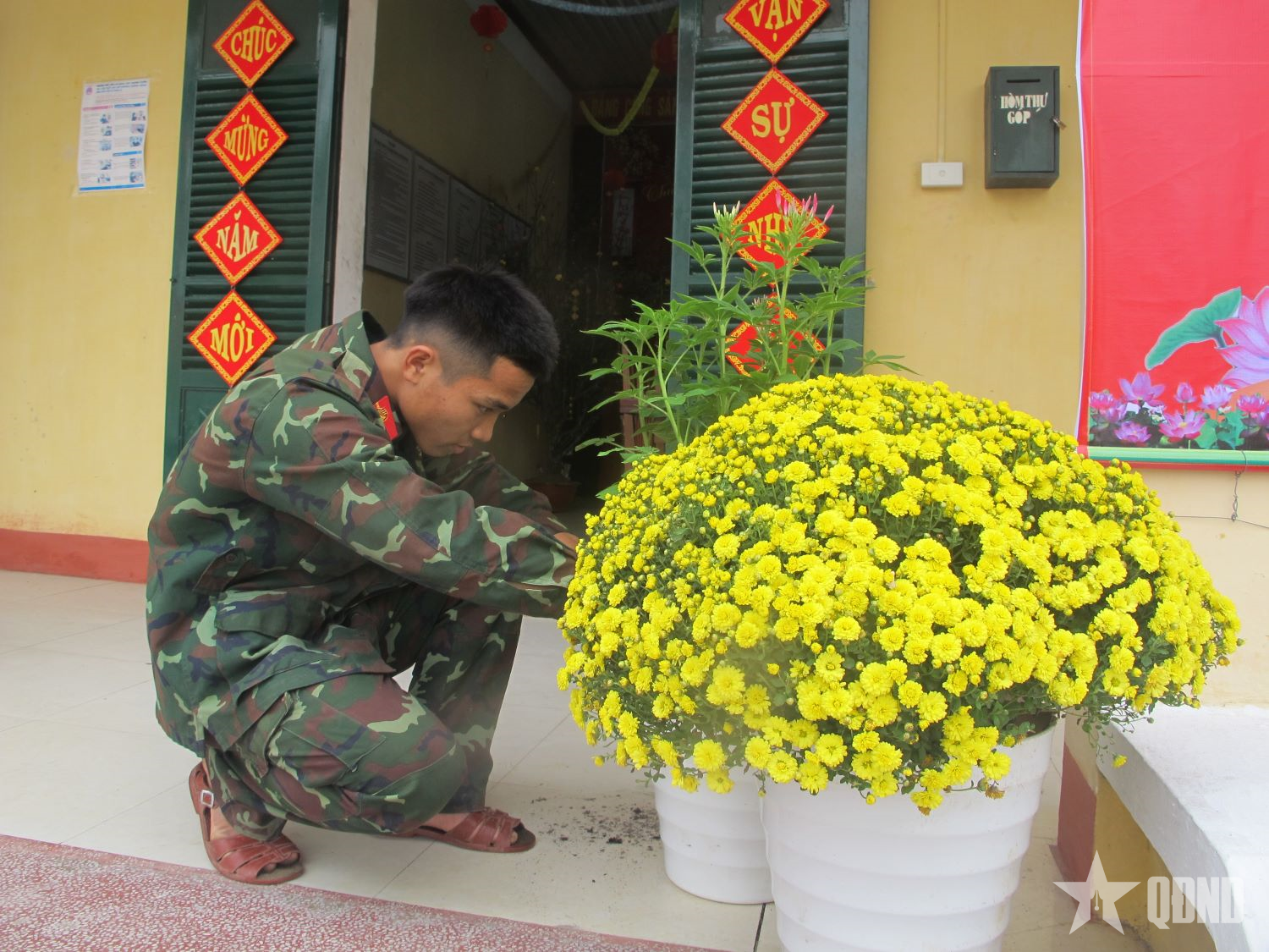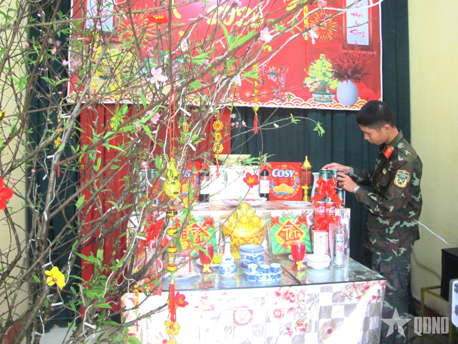 Những ngày giáp Tết, Tiểu đoàn 2 như khoác lên mình chiếc áo mới. Từ cổng đơn vị, cờ đỏ tung bay trong nắng sớm, những dây đèn và băng rôn được các chiến sĩ khéo léo mắc dọc lối đi. Sân doanh trại rộn ràng tiếng cười, tiếng búa gõ, tiếng gọi nhau í ới khi từng tổ, từng phân đội cùng nhau chỉnh trang khuôn viên, cắt tỉa cây xanh, quét dọn từng góc nhỏ. Mỗi chậu quất, cành đào được đặt ngay ngắn trước hiên nhà như mang cả mùa xuân về với doanh trại.