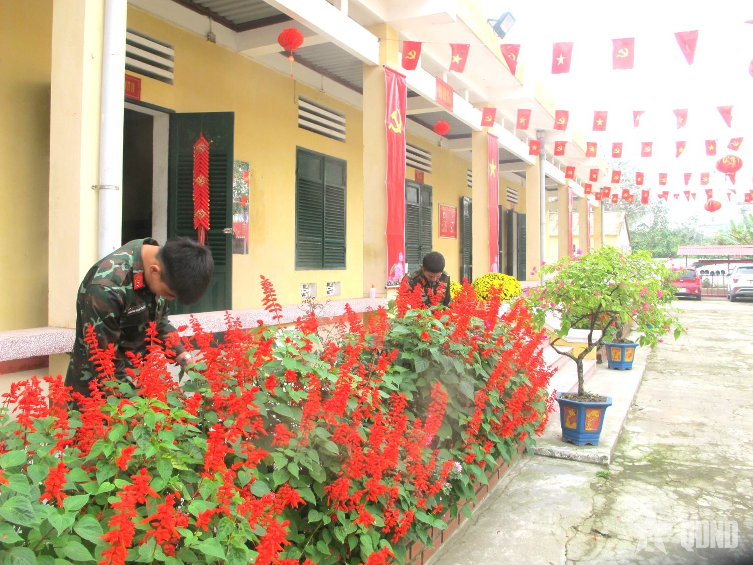Chiến sĩ Hồ Xương, Tiểu đoàn 2, Lữ đoàn Thông tin 80, Quân khu 4 chỉnh trang khuôn viên đơn vị để đón Tết.