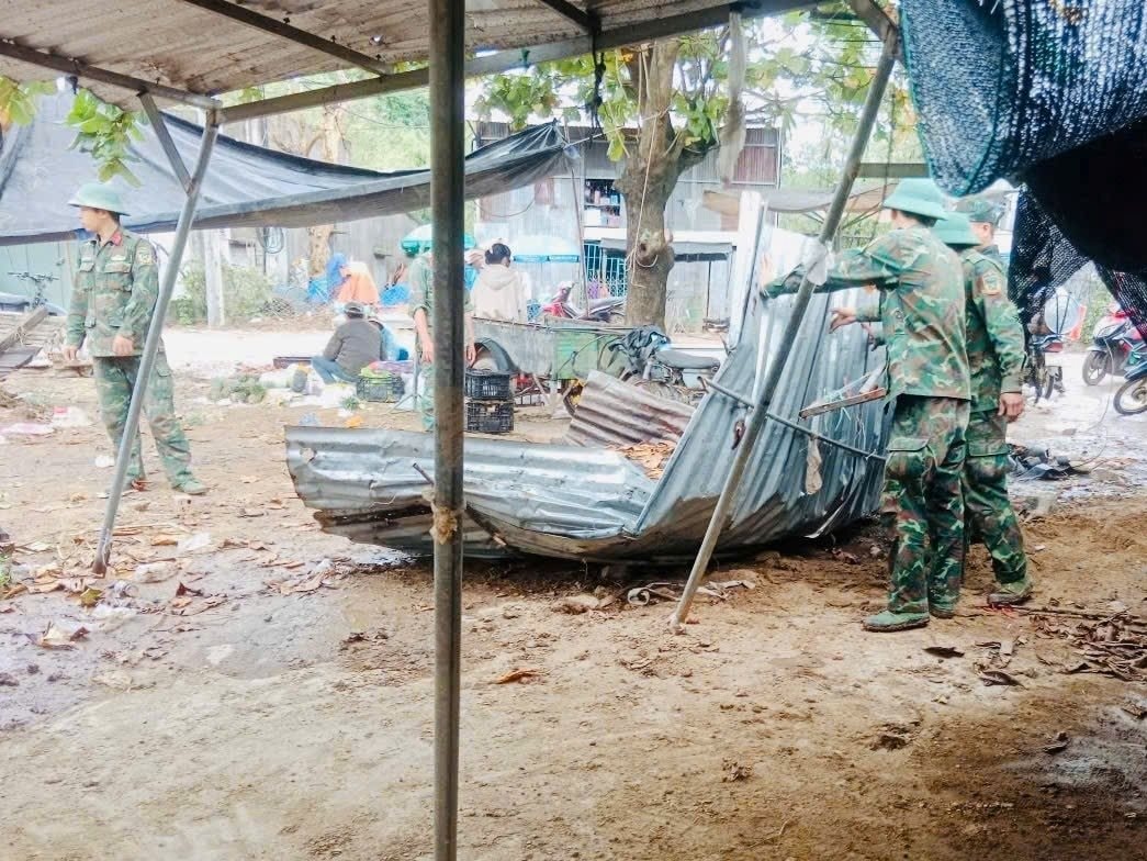 Cán bộ, chiến sĩ Trung đoàn 38 hỗ trợ người dân khắc phục hậu quả mưa lũ tại chợ mới thôn Trung Lương 1, xã Tuy An Tây (Đắk Lắk).