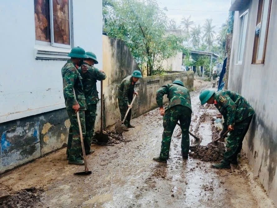 Lực lượng Trung đoàn 38 dọn bùn đất trên các tuyến đường liên thôn sau mưa lũ, giúp người dân sớm ổn định sinh hoạt.