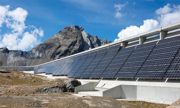 Pin năng lượng mặt trời lắp trên tường của đập cao nhất châu Âu. Ảnh: AlpinSolar