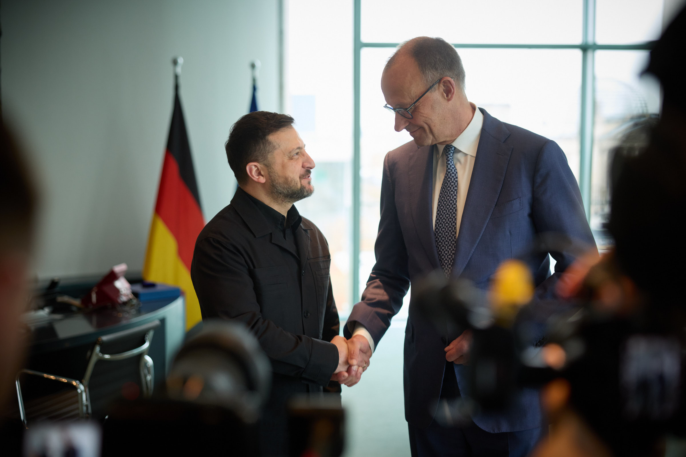 Tổng thống Ukraine - ông Volodymyr Zelensky (trái) và Thủ tướng Đức Friedrich Merz tại thủ đô Berlin (Đức) ngày 14-4. Ảnh: X