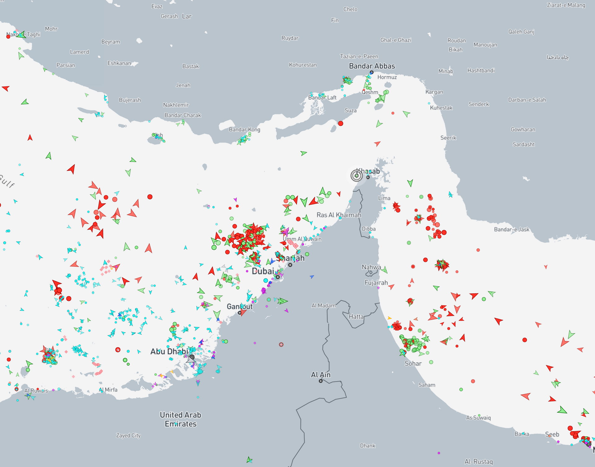 Ngày 7-3 tiếp tục chứng kiến giao thông qua eo biển Hormunz đình trệ vì chiến sự. Ảnh chụp màn hình.