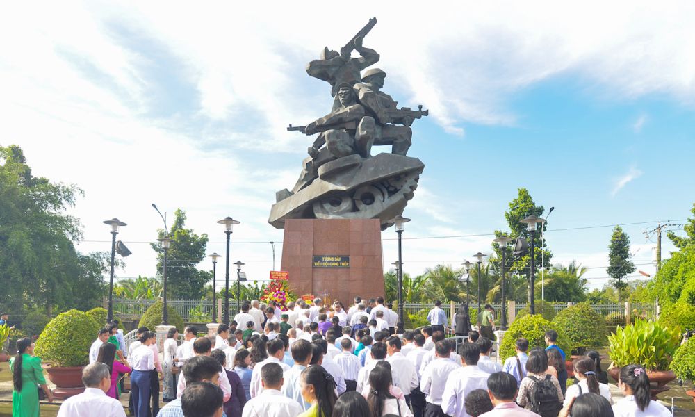 Lãnh đạo tỉnh Đồng Tháp dâng hoa, dâng hương tại Tượng đài Tiểu đội Gang Thép, Khu di tích quốc gia đặc biệt Chiến thắng Ấp Bắc. Ảnh: VĂN THẢO.