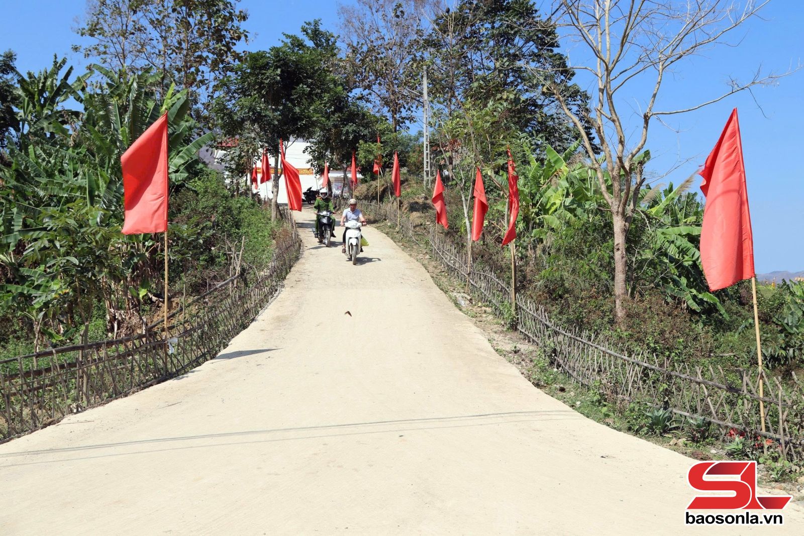 Đường vào trụ sở xã Chiềng Hoa treo cờ hồng kỳ rực rỡ.