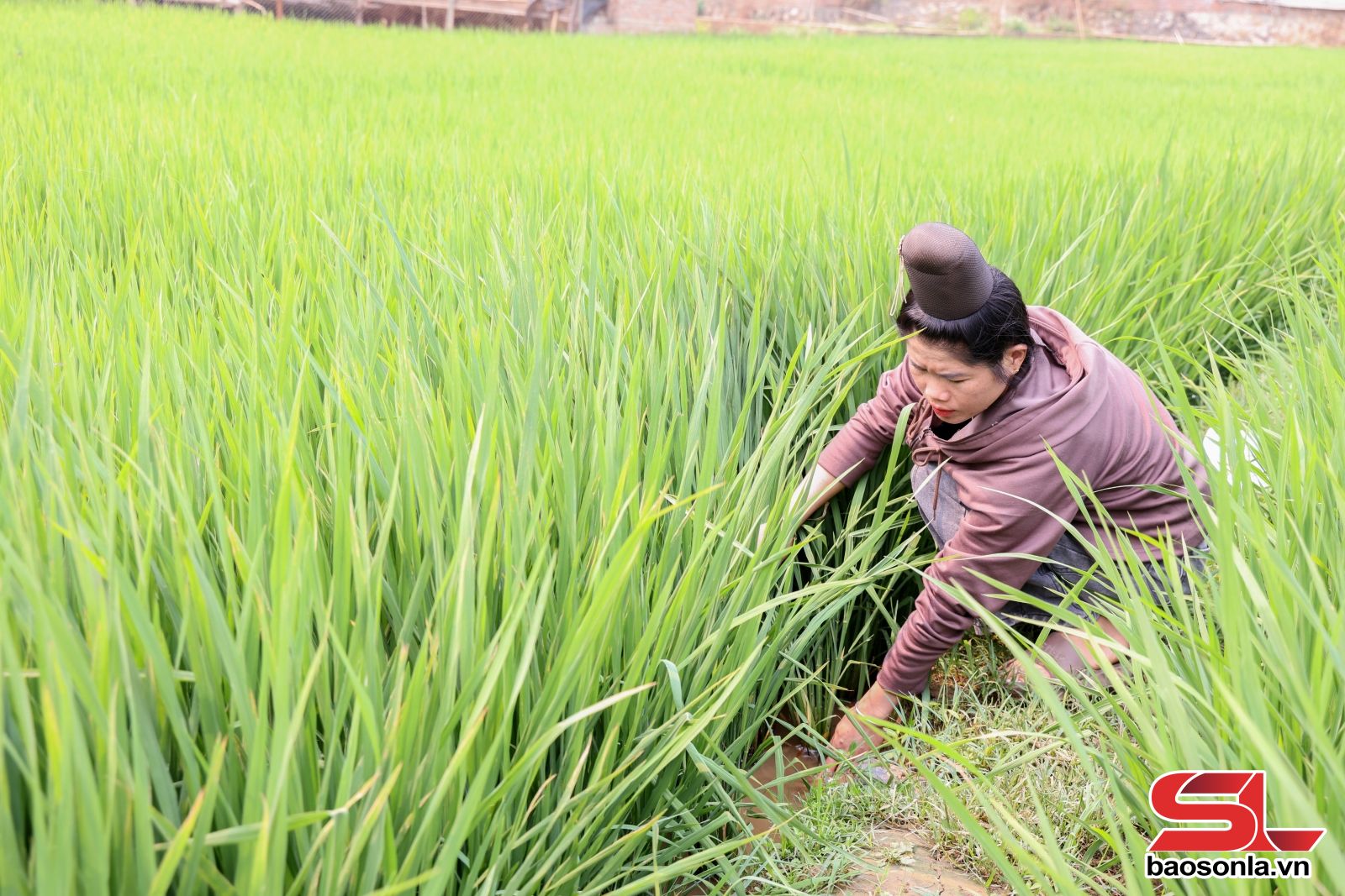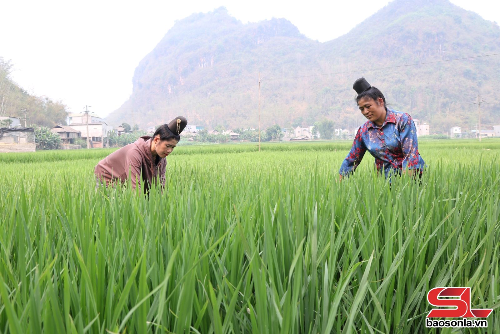 Người dân bản Hình, xã Chiềng La chăm sóc lúa xuân.