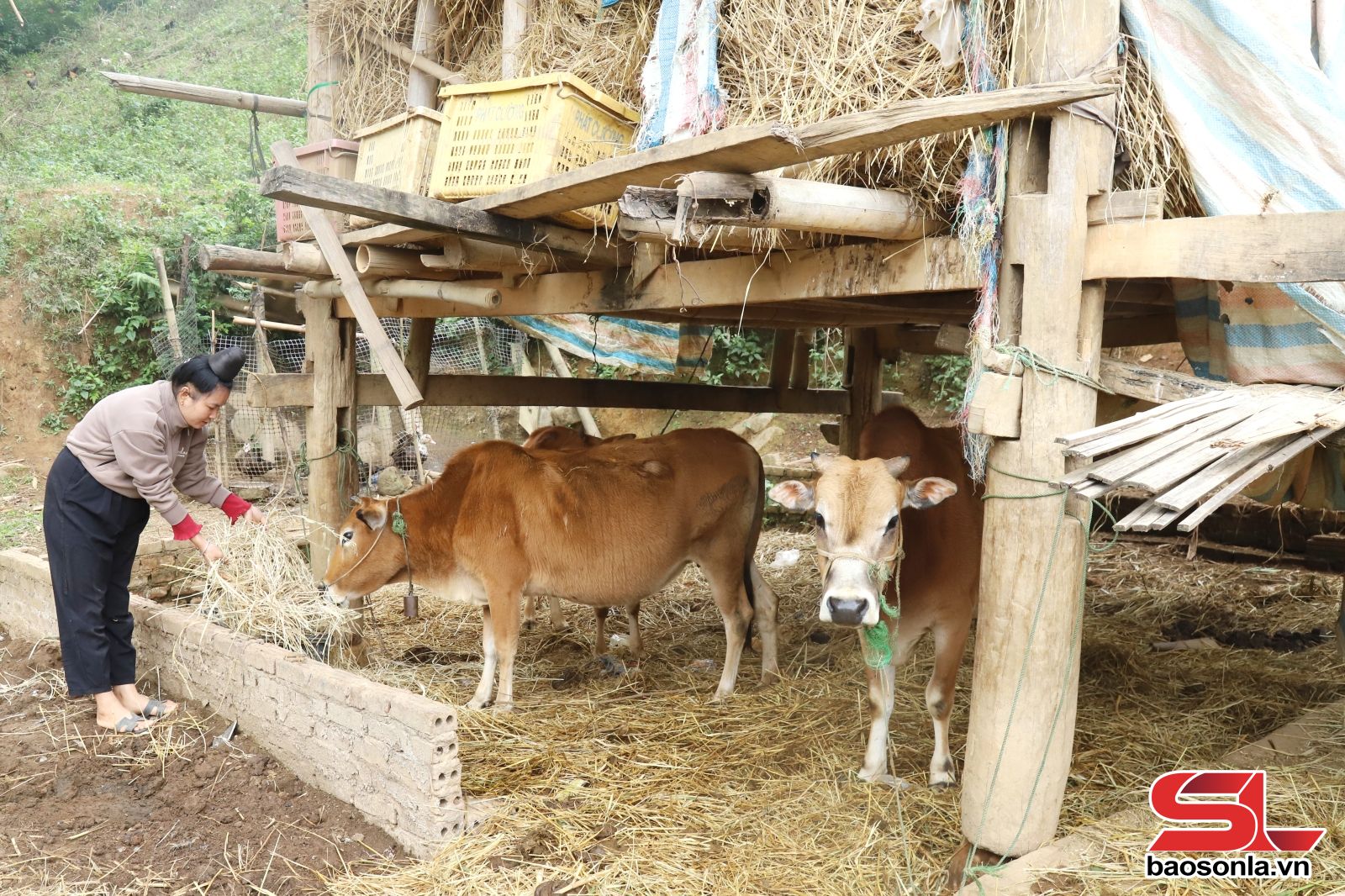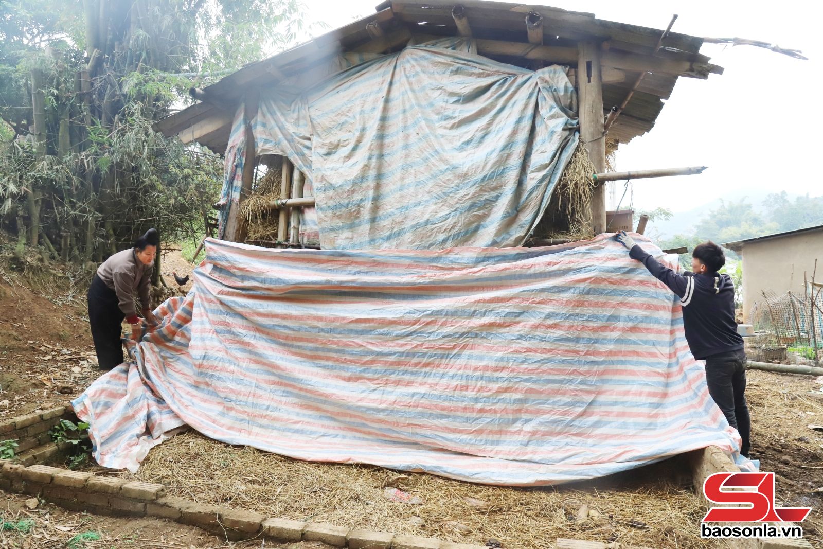 Nông dân xã Chiềng Sơ sử dụng bạt dứa che chắn chuồng trại giữ ấm cho đàn đại gia súc.