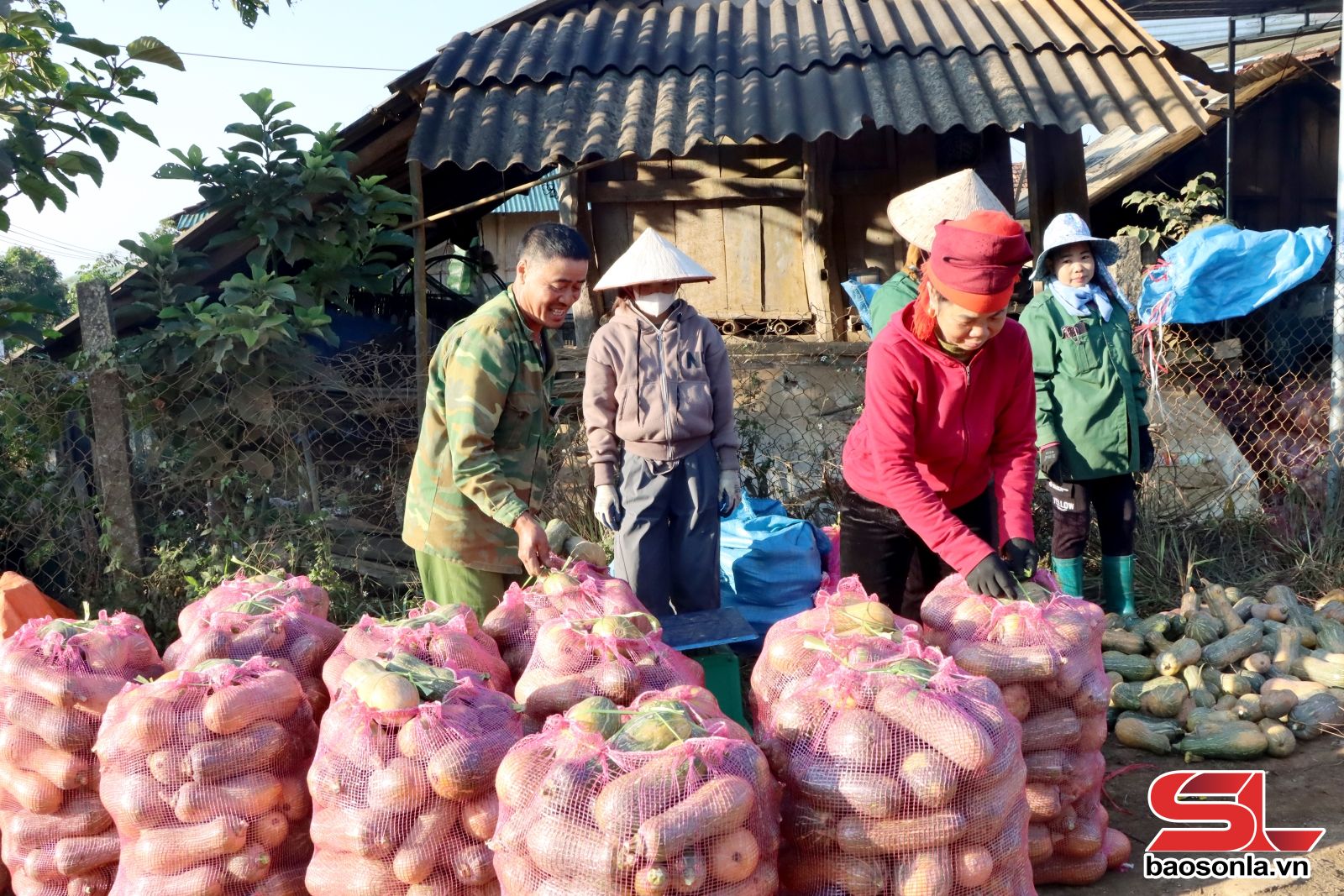 Nông dân bản Nong Sơn, xã Chiềng Sung đóng gói bí bán cho thương lái.