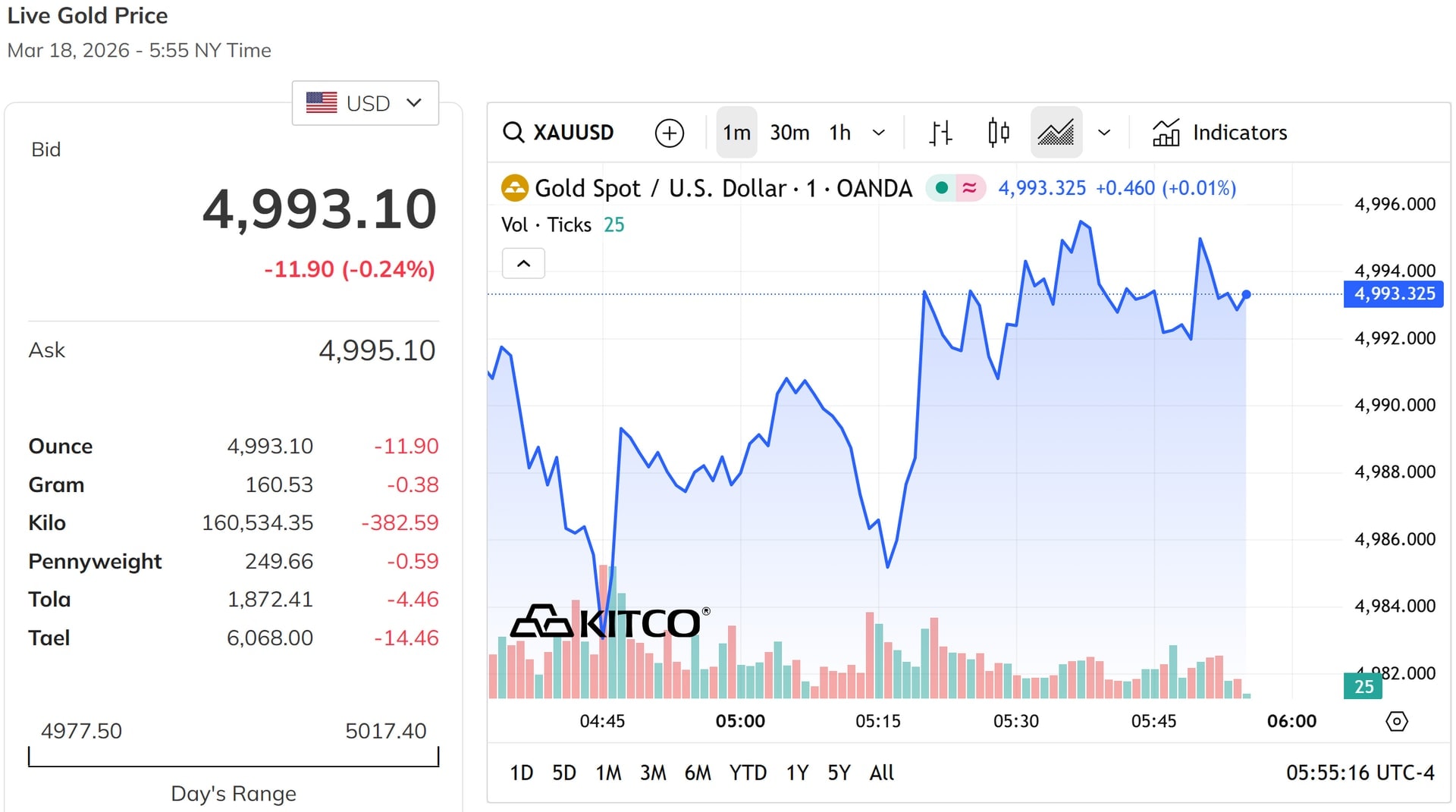 Tính đến 17h ngày 18/3 (giờ Việt Nam), giá vàng thế giới giao ngay đứng ở mức 4.993,1 USD/ounce, giảm 10,9 USD/ounce so với phiên trước đó. Quy đổi theo tỷ giá USD tại Vietcombank (26.328 VND/USD), mỗi lượng vàng thế giới giá khoảng 158,3 triệu đồng (chưa gồm thuế, phí).