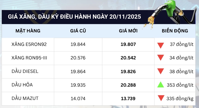 Theo đó, kể từ 15 giờ ngày 20-11, giá bán lẻ tối đa đối với các mặt hàng xăng dầu được áp dụng như sau: xăng E5RON92 có giá mới là 19.807 đồng/lít (giảm 37 đồng/lít), xăng RON95 có giá mới là 20.542 đồng/lít (giảm 34 đồng/lít), dầu diesel 0,05S là 19.826 đồng/lít (giảm 38 đồng/lít), dầu hỏa là 20.288 đồng/lít (tăng 353 đồng/lít), dầu mazut 180CST 3,5S là 13.739 đồng/kg (giảm 335 đồng/kg).