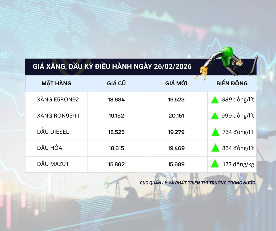 Cụ thể, từ 15 giờ hôm nay, xăng E5 tăng lên 19.523 đồng/lít, tăng 889 đồng/lít so với giá cơ sở hiện hành.