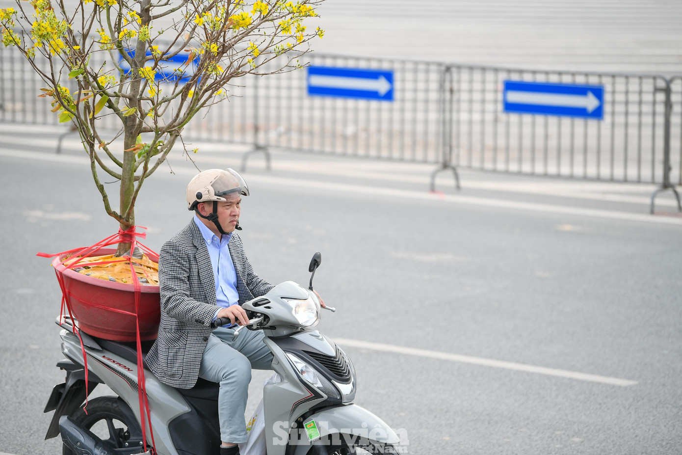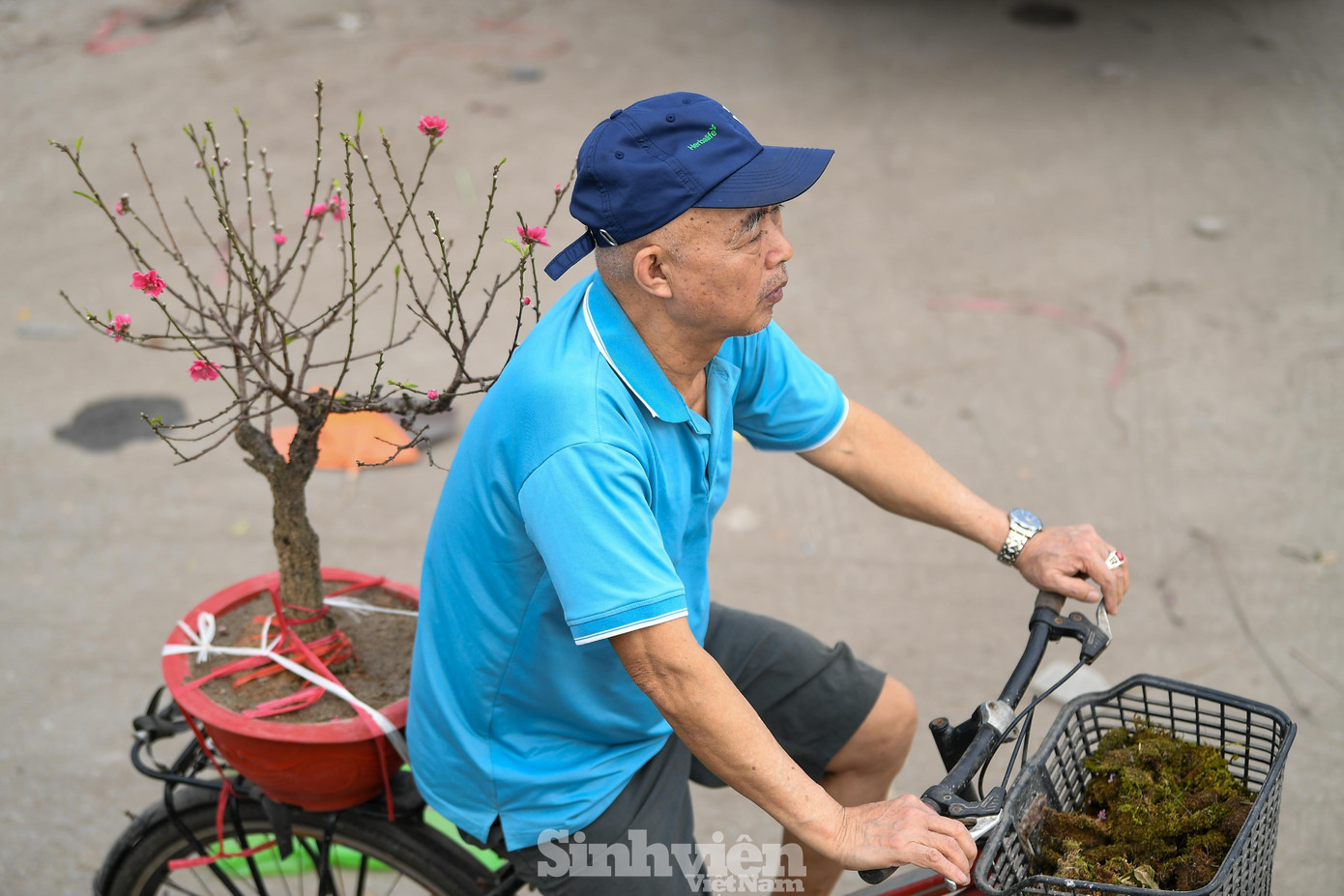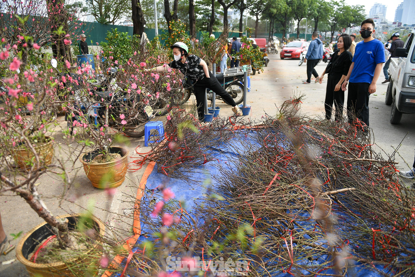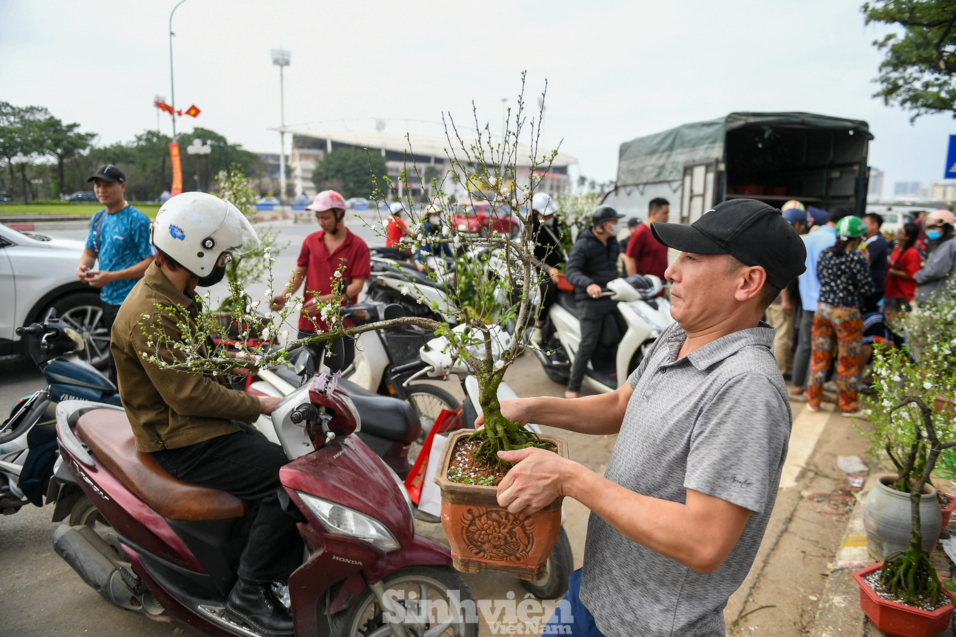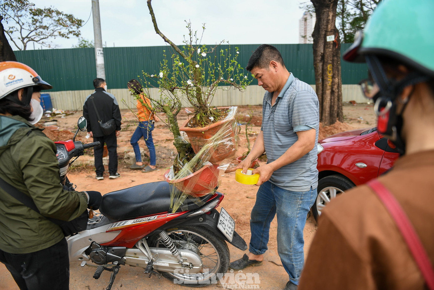 Ở chiều ngược lại, tiểu thương gần như không có phút nghỉ tay. Một bên nhận tiền, bên kia tháo dây, bọc gốc cây cho khách. Anh Quân (Chương Mỹ) cho biết, gia đình thuê điểm bán gần một tháng. “Chiều nay phải bán nhanh để còn dọn hàng, trả mặt bằng sạch theo quy định. Lãi ít cũng được, quan trọng là thu hồi vốn”, anh nói.